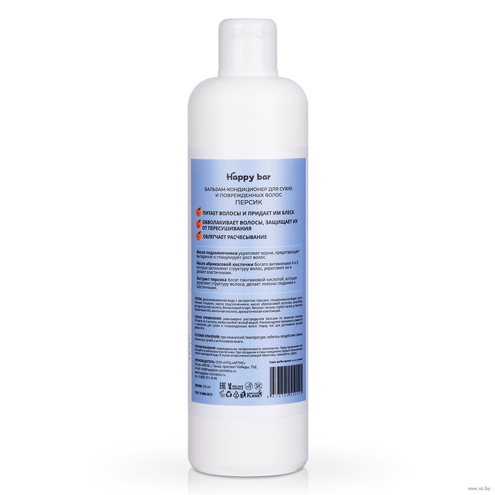 Равномерно распределите бальзам по влажным волосам. Оставьте на 3 минуты, затем смойте теплой водой. Рекомендуется применять совместно с шампунем для сухих и поврежденных волос Happy Bar для достижения лучшего результата.Состав