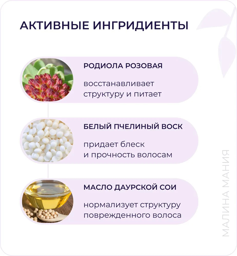 В сочетании с родиолой розовой, белый пчелиный воск (White beeswax) обеспечивает естественный блеск волосам, а масло даурской сои, содержащее большое количество ценного растительного белка, нормализует структуру повреждённого волоса.