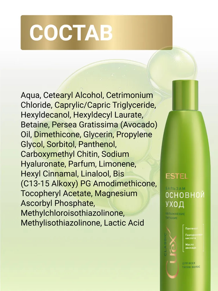 Aqua, Cetearyl Alcohol, Cetrimonium Chloride, Сaprylic/Capric Triglyceride, Bis (C13-15 Alkoxy) PG Amodimethicone, Dimethicone, Hexyldecanol, Hexyldecyl Laurate, Betaine, Persea Gratissima (Avocado) Oil, Glycerin, Propylene Glycol, Sorbitol, Panthenol, Carboxymethyl Chitin, Sodium Hyaluronate, Parfum, Limonene, Butylphenyl Methylpropional, Hexyl Cinnamal, Linalool, Citronellol, Tocopheryl Acetate, Magnesium Ascorbyl Phosphate, Methylchloroisothiazolinone, Methylisothiazolinone, Lactic Acid.Мы используем файлы cookie для обеспечения удобства работы с сайтом и его контакта с пользователем.