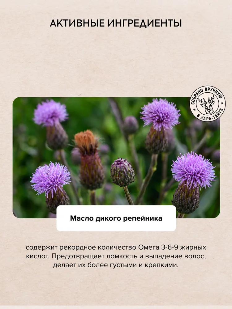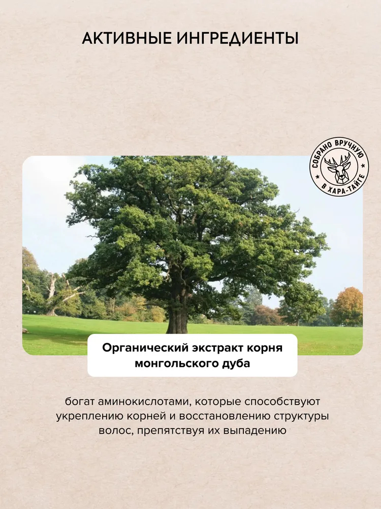 Монгольский дуб – могучее дерево тайги. Органический экстракт корня монгольского дуба богат аминокислотами, которые способствуют укреплению и восстановлению структуры волос, препятствуя их истончению. Масло дикого репейника содержит незаменимые Омега 3-6-9 жирные кислоты, которые питают волосы и наполняют их жизненной силой.