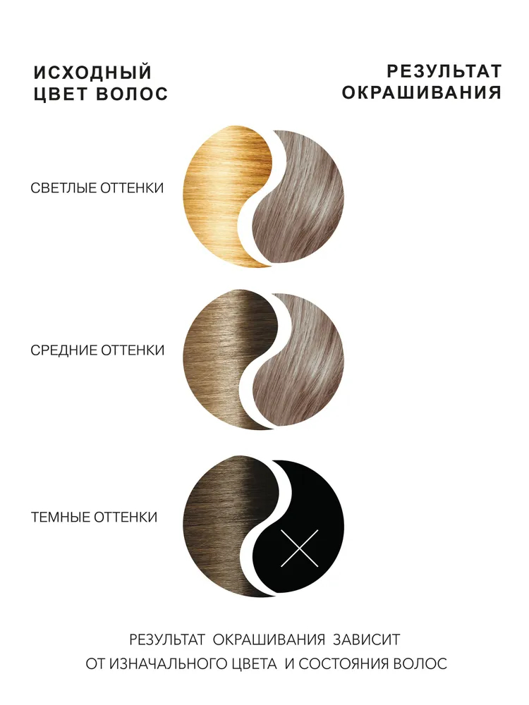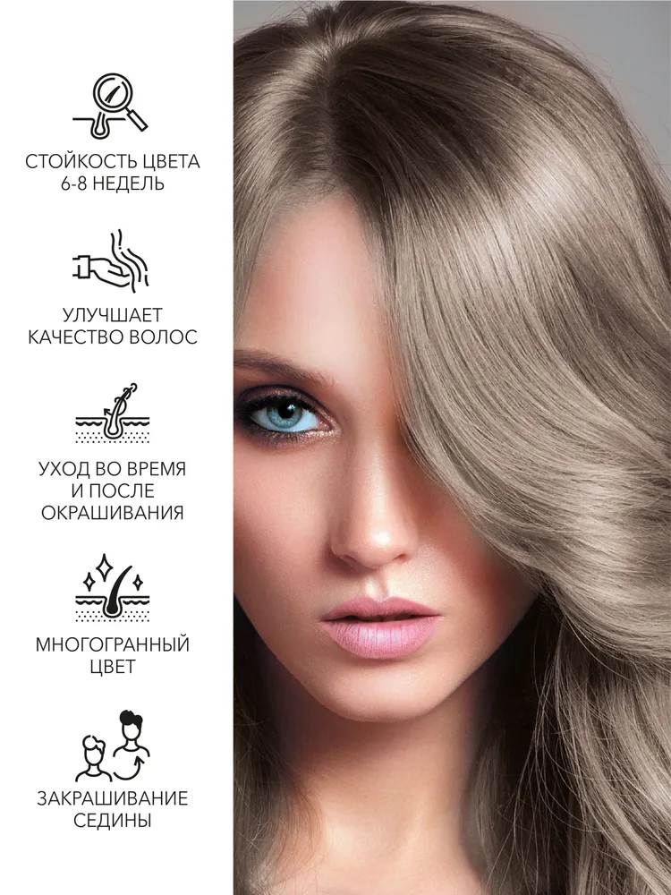 Надежное закрашивание седины, сияющий и яркий цвет, мягкие и эластичные волосы после окрашивания.