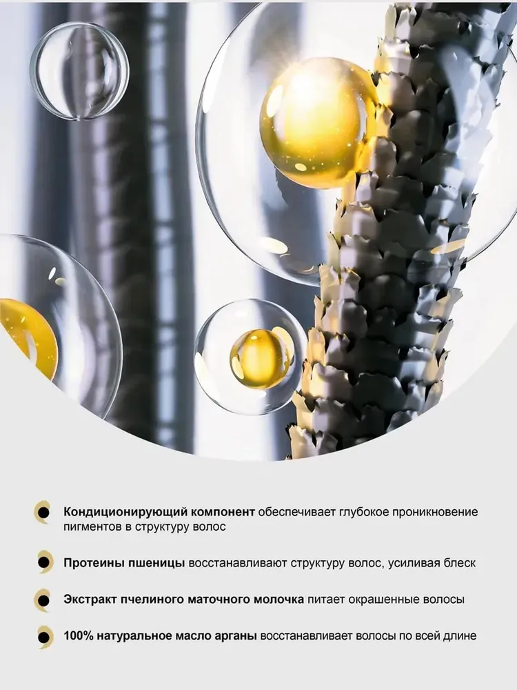 Активная формула краски с кондиционирующим компонентом способствует более глубокому проникновению цветовых пигментов в структуру волос, обеспечивая длительную защиту цвета. Протеины пшеницы восстанавливают структуру волос, делая их здоровыми и блестящими. Бальзам "Закрепление цвета" с натуральным экстрактом пчелиного маточного молочка и 100% натуральным маслом арганы питает окрашенные волосы изнутри и восстанавливает их по всей длине.