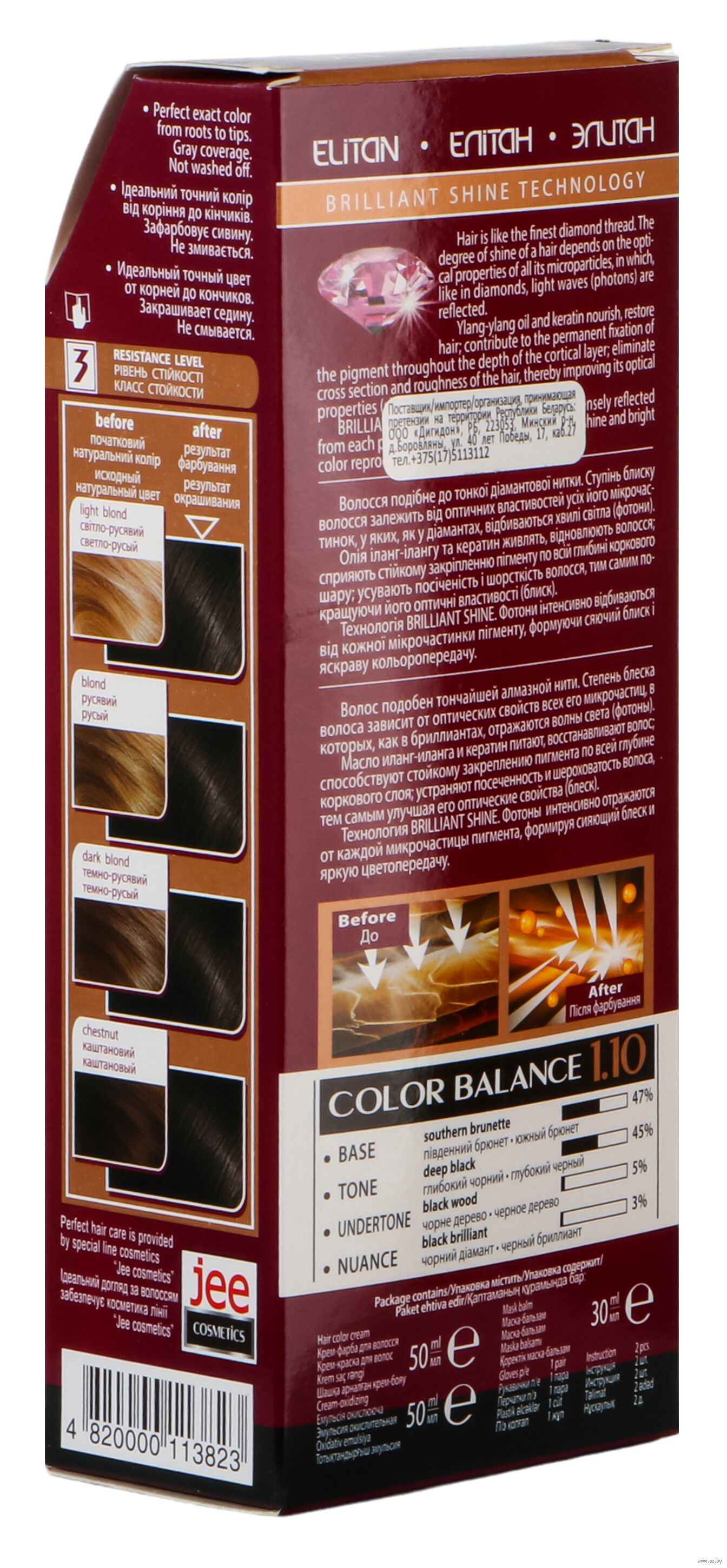 Входящее в состав краски масло иланг-иланга питает, восстанавливает волосы. Способствует стойкому закреплению пигмента по всей глубине коркового слоя. Устраняет посеченность и шероховатость волоса, тем самым улучшая его оптические свойства (блеск). Стойкая крем-краска Элитан Intensive Hair Color Cream содержит новую технологию окрашивания Brilliant Shine c масом ylang-ylang. Фотоны интенсивно отражаются от каждой микрочастицы пигмента, формируя сияющий блеск и обеспечивая полную цветопередачу.