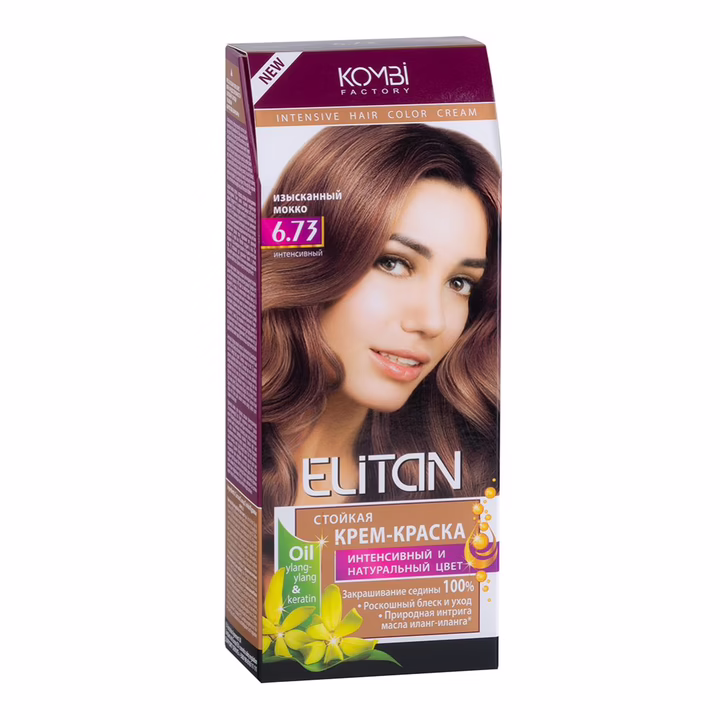 Входящее в состав краски масло иланг-иланга питает, восстанавливает волосы. Способствует стойкому закреплению пигмента по всей глубине коркового слоя. Устраняет посеченность и шероховатость волоса, тем самым улучшая его оптические свойства (блеск). Стойкая крем-краска Элитан Intensive Hair Color Cream содержит новую технологию окрашивания Brilliant Shine c масом ylang-ylang. Фотоны интенсивно отражаются от каждой микрочастицы пигмента, формируя сияющий блеск и обеспечивая полную цветопередачу.