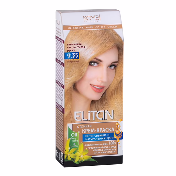 Входящее в состав краски масло иланг-иланга питает, восстанавливает волосы. Способствует стойкому закреплению пигмента по всей глубине коркового слоя. Устраняет посеченность и шероховатость волоса, тем самым улучшая его оптические свойства (блеск). Стойкая крем-краска Элитан Intensive Hair Color Cream содержит новую технологию окрашивания Brilliant Shine c масом ylang-ylang. Фотоны интенсивно отражаются от каждой микрочастицы пигмента, формируя сияющий блеск и обеспечивая полную цветопередачу.