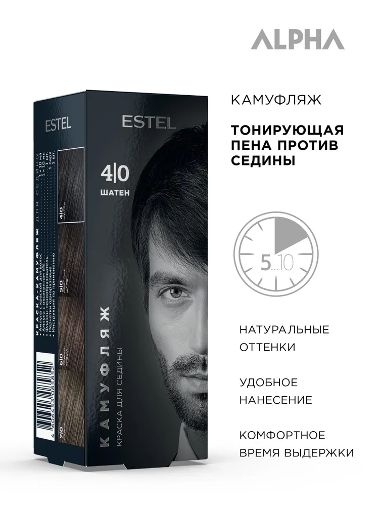 Внимательно ознакомьтесь с инструкцией перед применением. Пропорция 1:1. Во флакон-пенообразователь поместите 10 мл красителя и 10 мл оксигента. Смешайте, вращая флакон, не встряхивать. Равномерно нанесите на волосы. Время выдержки 5-10 минут. Смойте теплой водой с применением шампуня и бальзама для стабилизации цвета. При окрашивании бороды обязательно использовать Estel No Stress Аква-гель для снятия раздражения с кожи.Состав