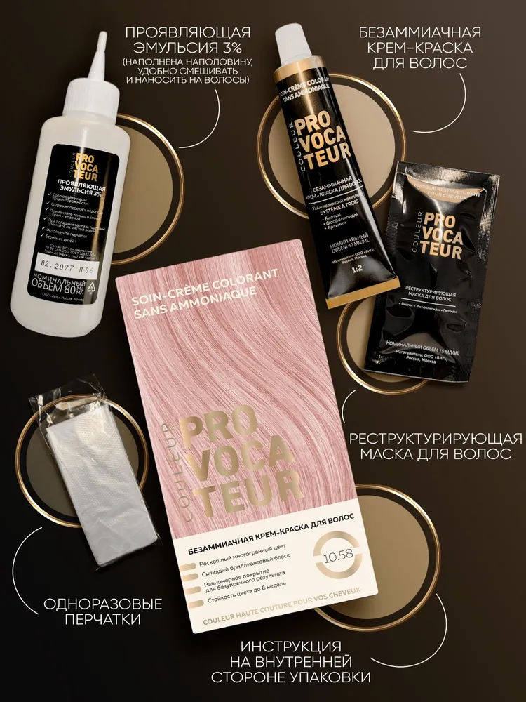 Ухаживающие комплексы Système à trois с активными ингредиентами в формулах PROVOCATEUR подобраны индивидуально для достижения совершенного результата, и обеспечивают интенсивный уход за волосами на всех этапах. Крем-краска обогащена БИОТИНОМ для блеска волос, СОЕВЫМИ ФОСФОЛИПИДАМИ для защиты от повреждений, АРГИНИНОМ для укрепления структуры снаружи и внутри.
