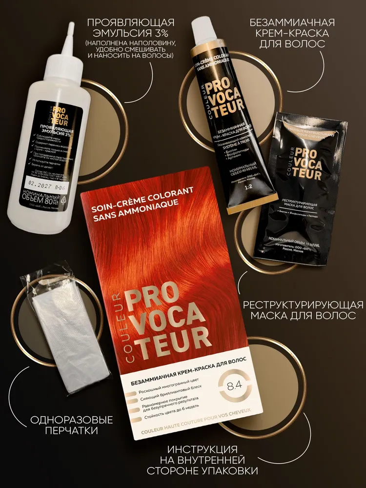 Ухаживающие комплексы Système à trois с активными ингредиентами в формулах PROVOCATEUR подобраны индивидуально для достижения совершенного результата, и обеспечивают интенсивный уход за волосами на всех этапах. Крем-краска обогащена БИОТИНОМ для блеска волос, СОЕВЫМИ ФОСФОЛИПИДАМИ для защиты от повреждений, АРГИНИНОМ для укрепления структуры снаружи и внутри.