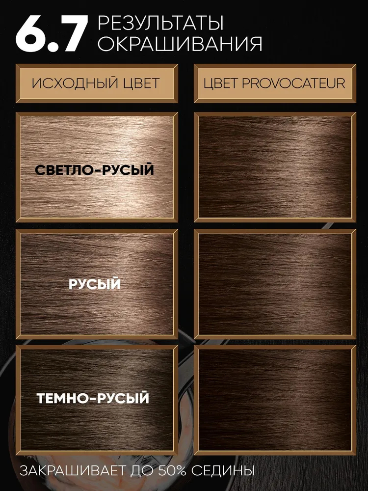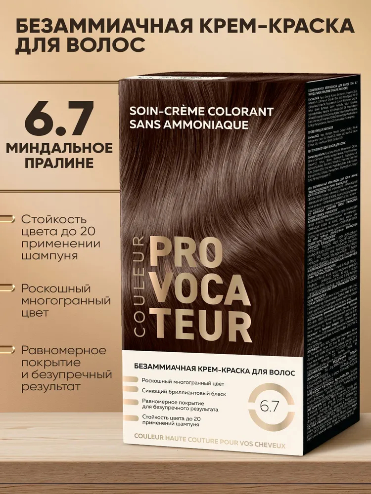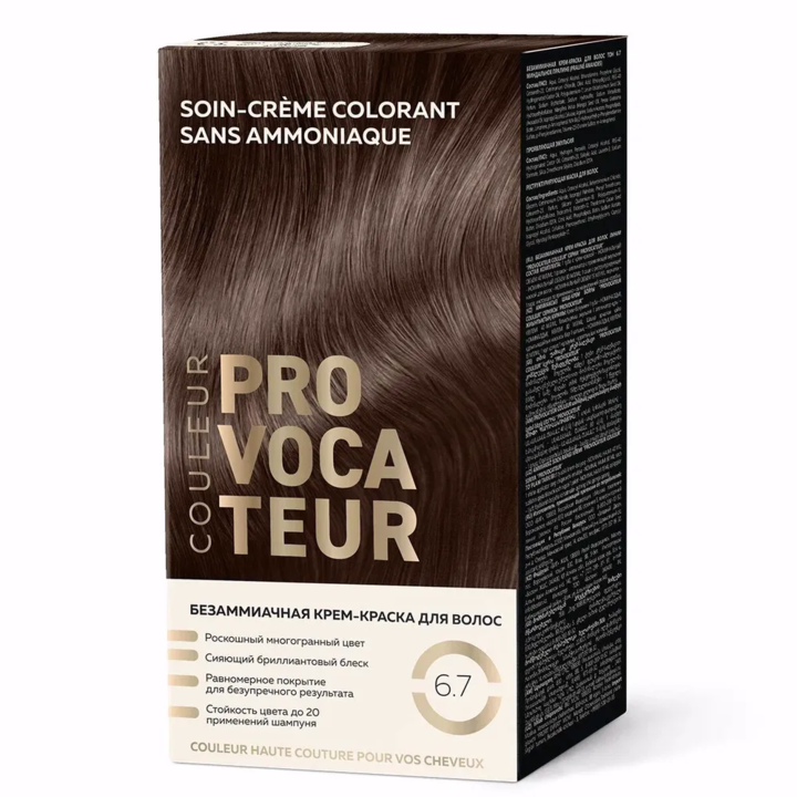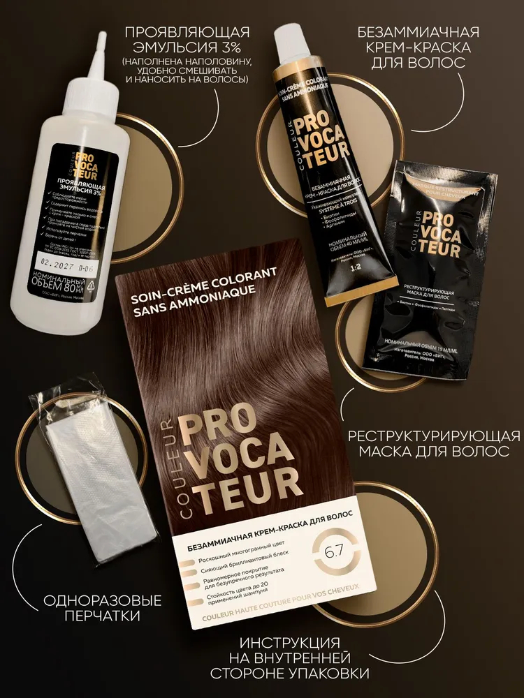 Ухаживающие комплексы Système à trois с активными ингредиентами в формулах PROVOCATEUR подобраны индивидуально для достижения совершенного результата, и обеспечивают интенсивный уход за волосами на всех этапах. Крем-краска обогащена БИОТИНОМ для блеска волос, СОЕВЫМИ ФОСФОЛИПИДАМИ для защиты от повреждений, АРГИНИНОМ для укрепления структуры снаружи и внутри.