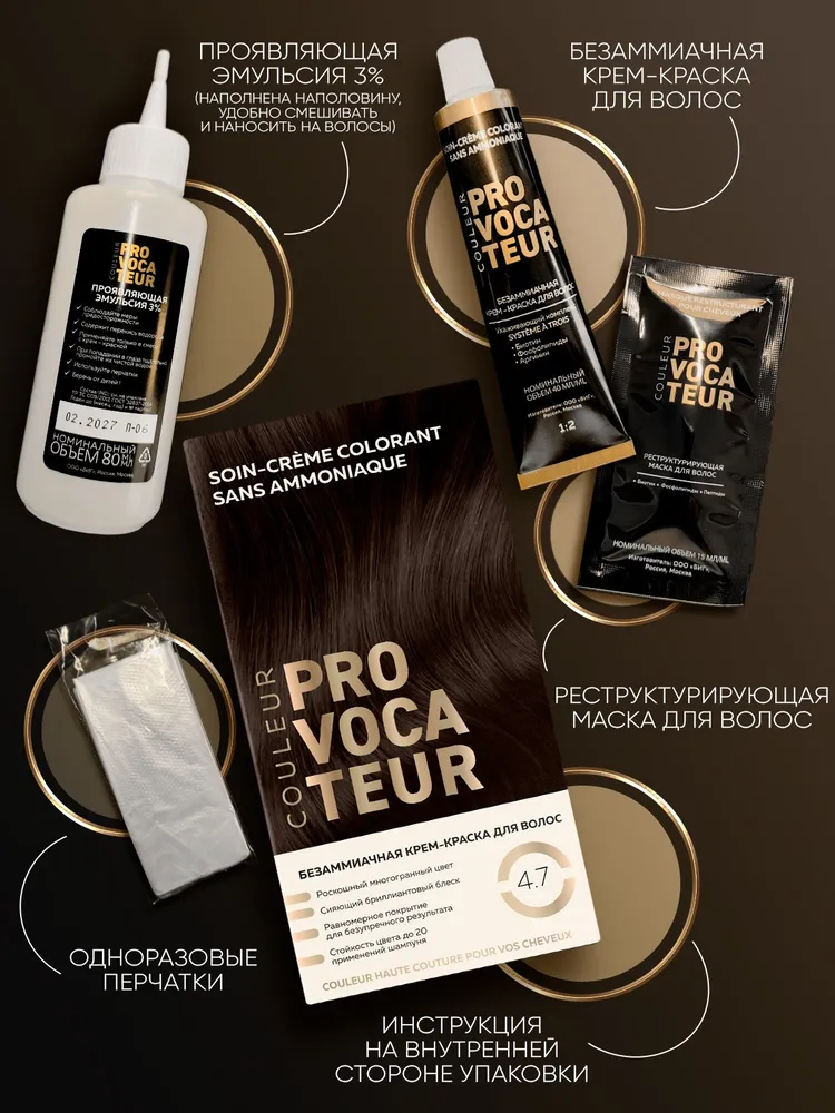 Ухаживающие комплексы Système à trois с активными ингредиентами в формулах PROVOCATEUR подобраны индивидуально для достижения совершенного результата, и обеспечивают интенсивный уход за волосами на всех этапах. Крем-краска обогащена БИОТИНОМ для блеска волос, СОЕВЫМИ ФОСФОЛИПИДАМИ для защиты от повреждений, АРГИНИНОМ для укрепления структуры снаружи и внутри.