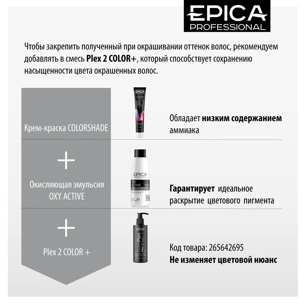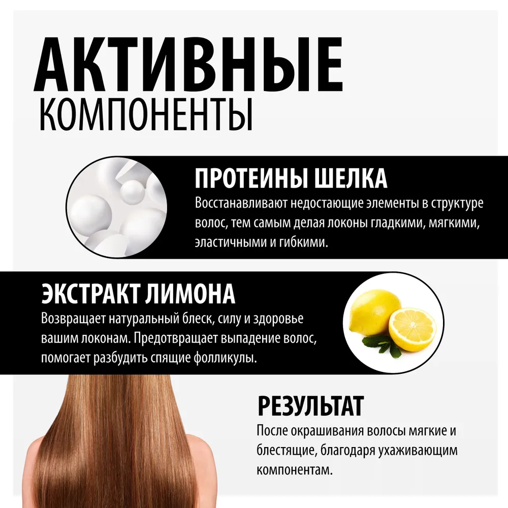 Благодаря содержанию натуральных масел и пантенола краска быстро впитывается в структуру волос и оказывает ухаживающее действие. Придает глубокий стойкий цвет, смягчает текстуру волос и наполняет изысканным блеском по всей длине.