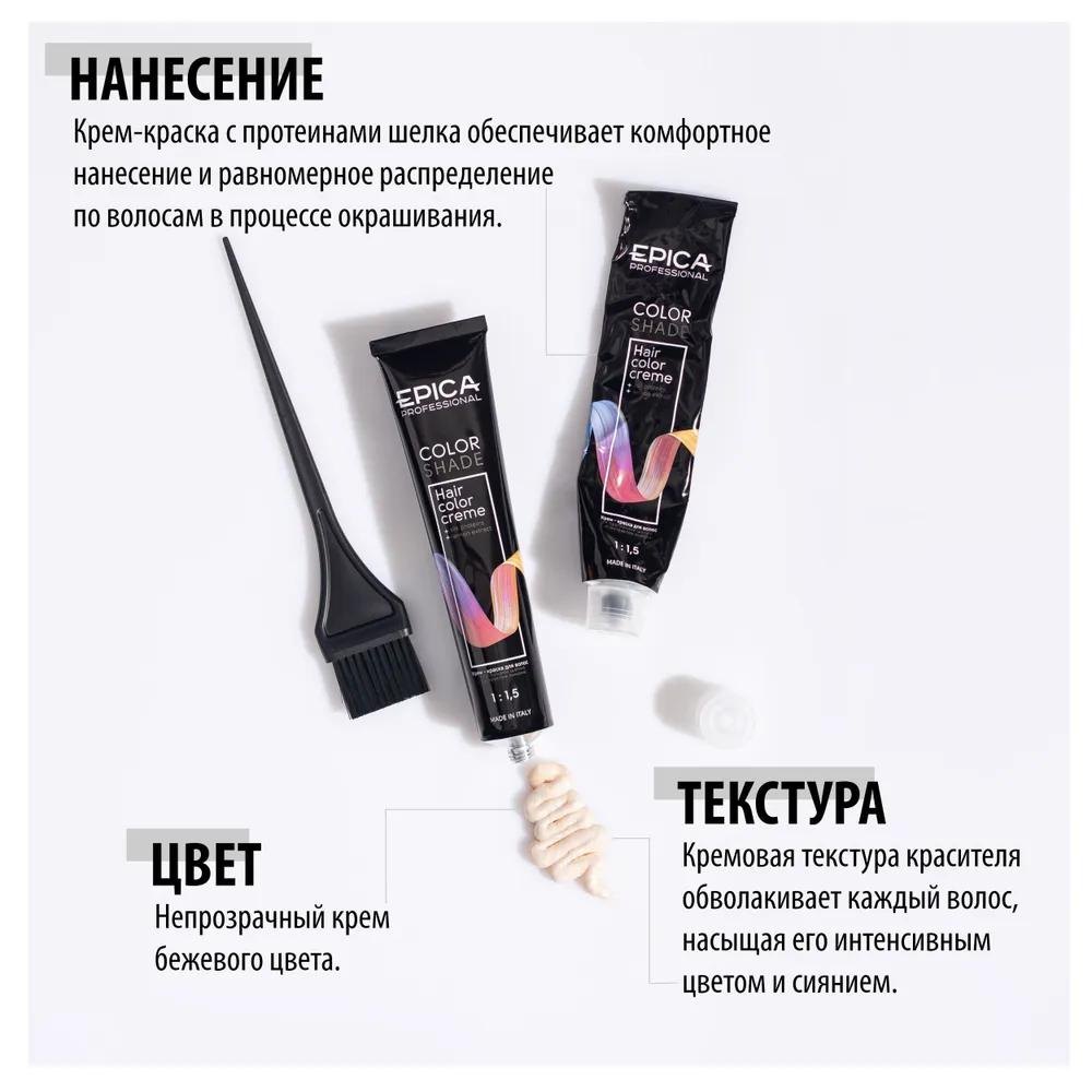 Благодаря содержанию натуральных масел и пантенола краска быстро впитывается в структуру волос и оказывает ухаживающее действие. Придает глубокий стойкий цвет, смягчает текстуру волос и наполняет изысканным блеском по всей длине.