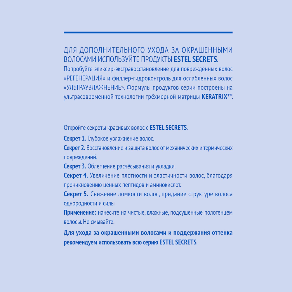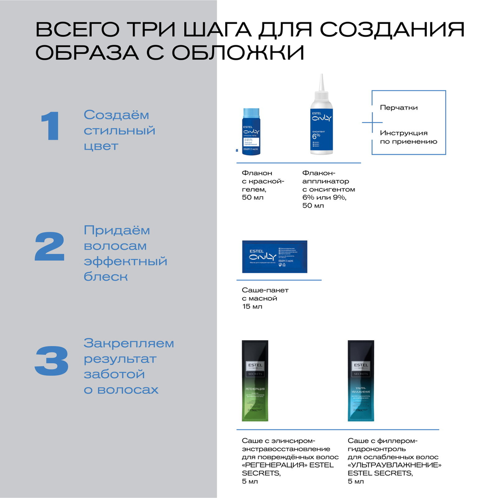Упаковка содержит: флакон с краской-гелем, флакон-аппликатор с оксигеном, саше-пакет с маской, тубу с сывороткой-защитой цвета волос "Estel Beauty Hair Lab", перчатки.