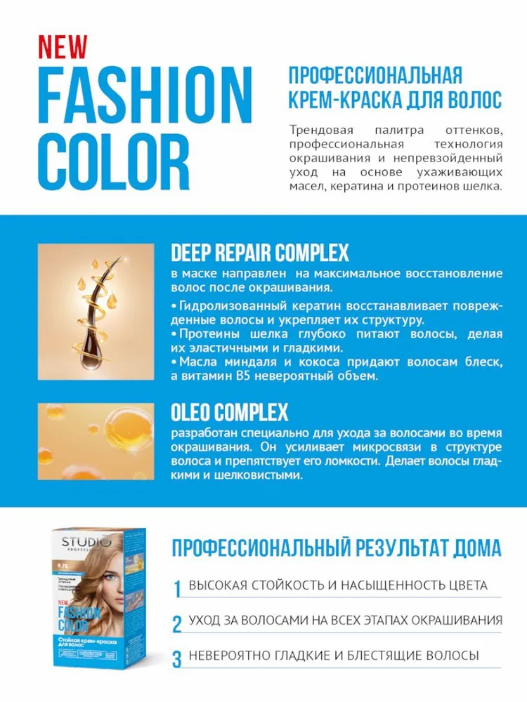Стойкая краска для волос Fashion Color – это профессиональная технология окрашивания и непревзойденный уход на основе ухаживающих масел, кератина и протеинов шелка.