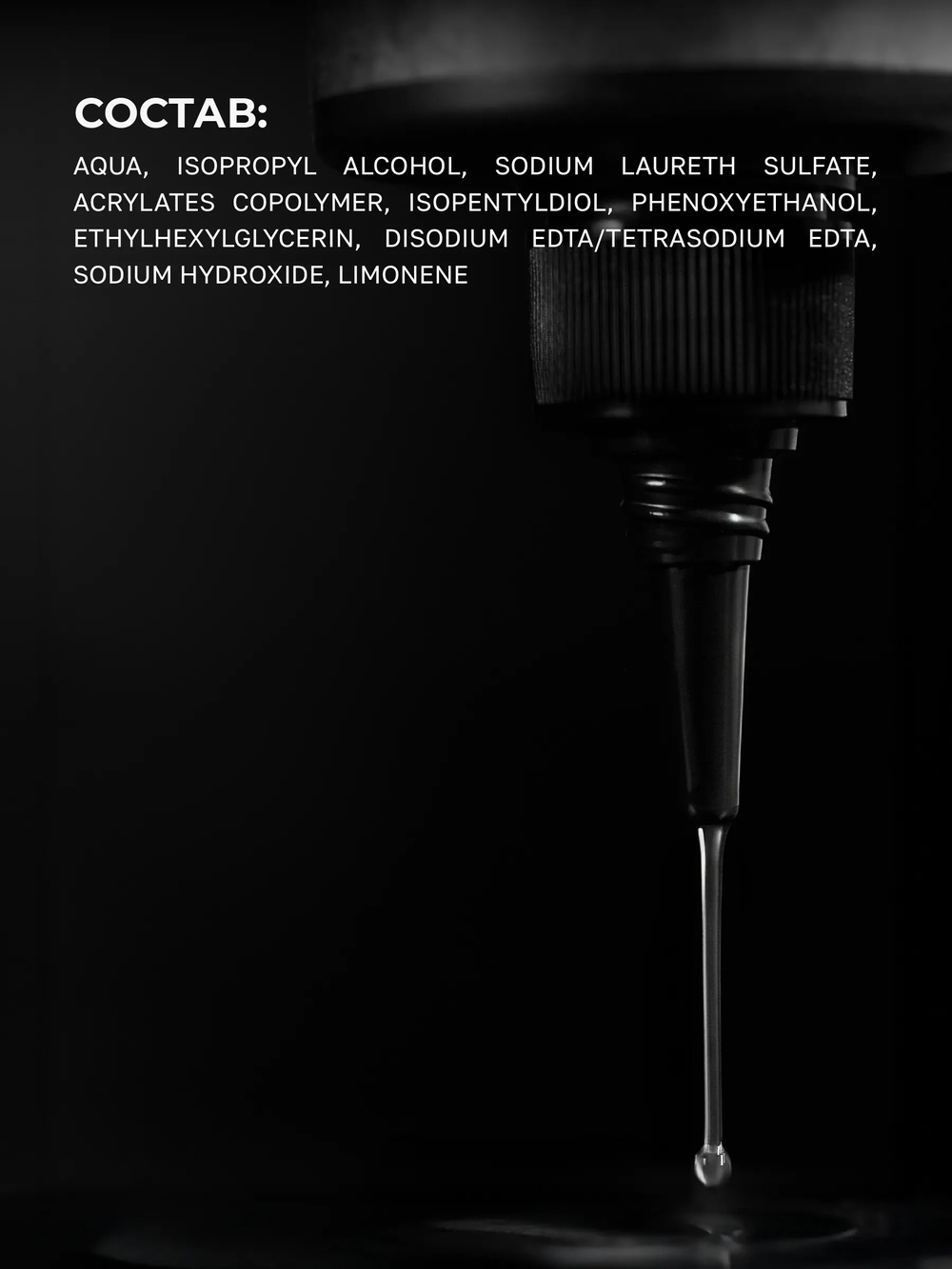 Aqua, Isopropyl Alcohol, Sodium Laureth Sulfate, Acrylates Copolymer, Isopentyldiol, Phenoxyethanol, Ethylhexylglycerin, Tetrasodium EDTA, Sodium Hydroxide, Limonene.Мы используем файлы cookie для обеспечения удобства работы с сайтом и его контакта с пользователем.