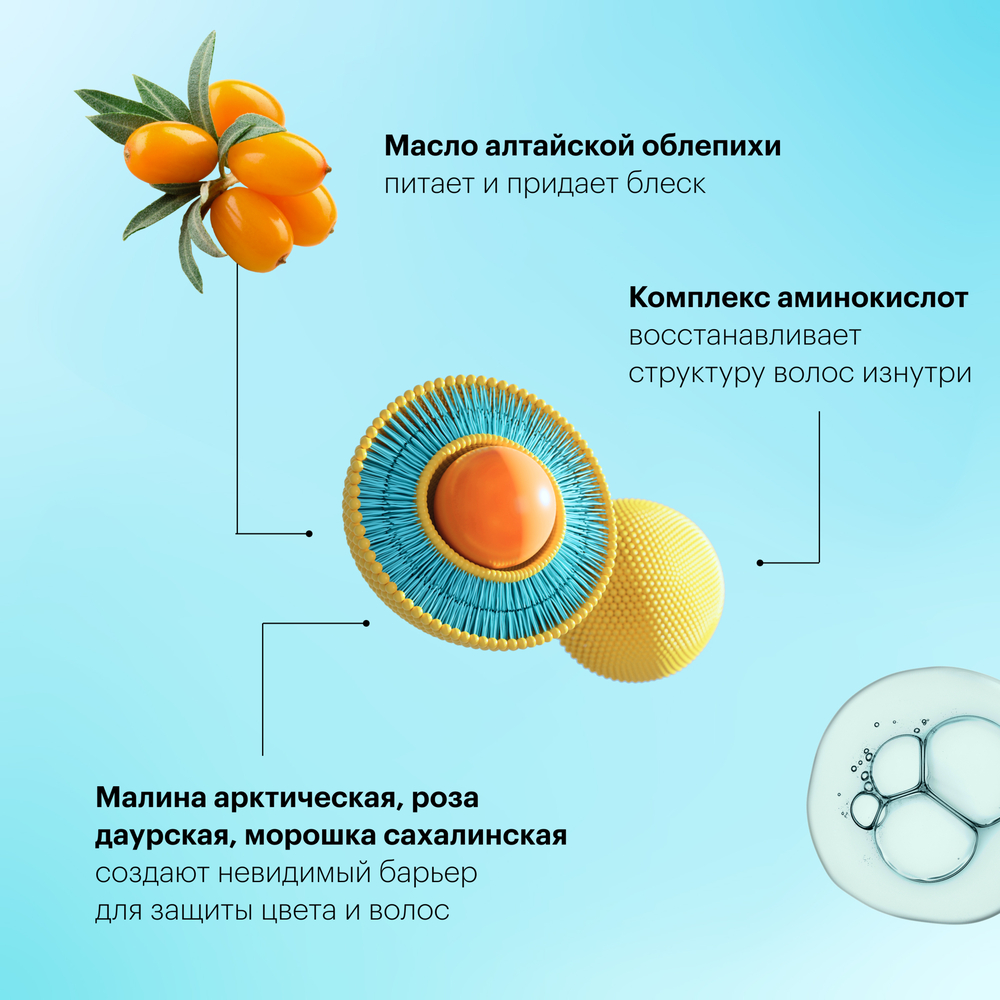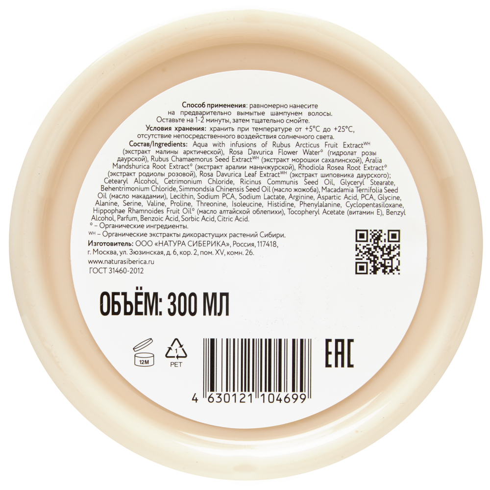 Aqua with infusions of Rubus Arcticus Fruit ExtractWH (экстракт малины арктической), Rosa Davurica Flower Water* (гидролат розы даурской), Rubus Chamaemorus Seed ExtractWH (экстракт морошки сахалинской), Aralia Mandshurica Root Extract* (экстракт аралии маньчжурской), Rhodiola Rosea Root Extract* (экстракт родиолы розовой), Rosa Davurica Leaf ExtractWH (экстракт шиповника даурского); Cetearyl Alcohol, Cetrimonium Chloride, Ricinus Communis Seed Oil, Glyceryl Stearate, Behentrimonium Chloride, Simmondsia Chinensis Seed Oil (масло жожоба), Macadamia Ternifolia Seed Oil (масло макадамии), Lecithin, Sodium PCA, Sodium Lactate, Arginine, Aspartic Acid, PCA, Glycine, Alanine, Serine, Valine, Proline, Threonine, Isoleucine, Histidine, Phenylalanine, Cyclopentasiloxane, Hippophae Rhamnoides Fruit Oil* (масло алтайской облепихи), Tocopheryl Acetate (витамин Е), Benzyl Alcohol, Parfum, Benzoic Acid, Sorbic Acid, Citric Acid. * – Органические ингредиенты WH – Органические экстракты дикорастущих растений Сибири