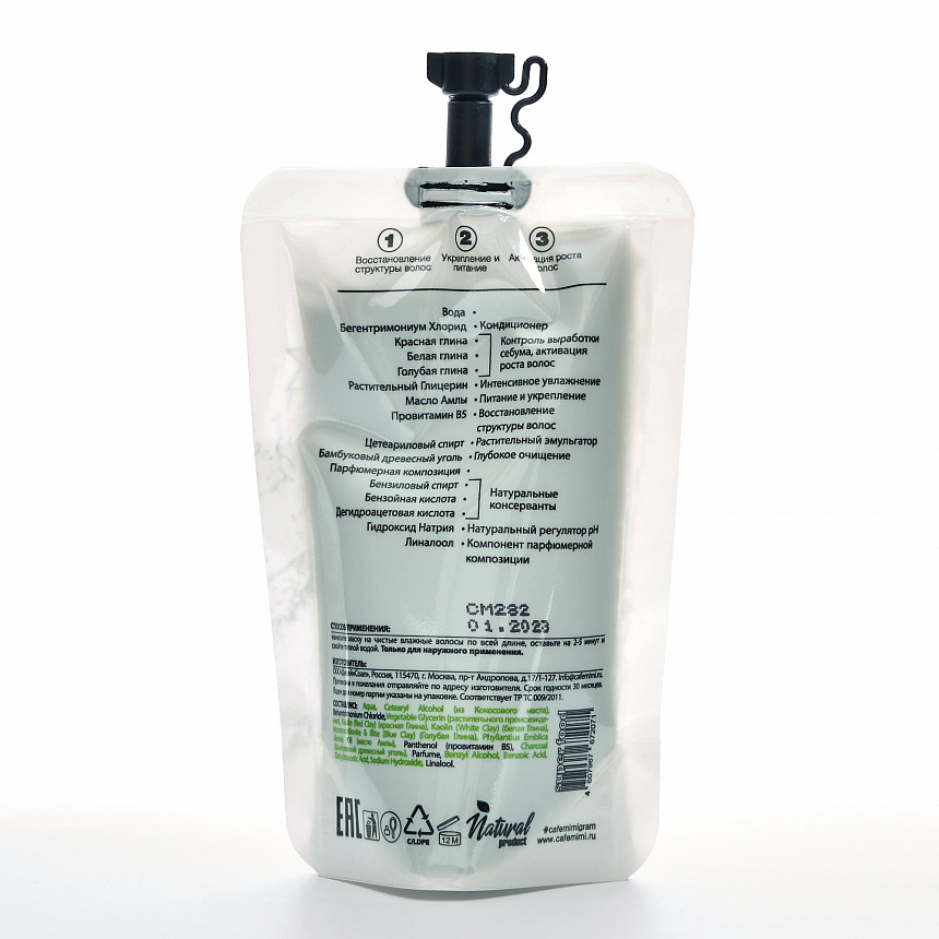 Aqua, Cetearyl Alcohol (из Кокосового масла), Behentrimonium Chloride, Vegetable Glycerin (растительного происхождения), Kaolin (Red Clay) (красная Глина), Kaolin (White Clay) (белая Глина), Montmorillonite & Illite (Blue Clay) (Голубая Глина), Phyllantius Emblica (Amla) Oil (масло Амлы), Panthenol (провитамин В5), Charcoal (Уголь), Parfume, Benzyl Alcohol, Benzoic Acid, Dehydroacetic Acid, Sodium Hydroxide, Linalool