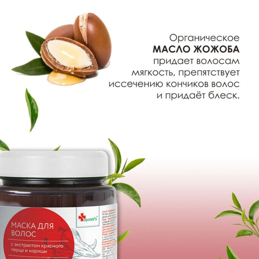 Маска на основе экстракта красного перца, корицы и природных масел, способствует интенсивному укреплению и росту волос. Красный перец повышает снабжение волосяных луковиц кислородом и питательными веществами. Корица, входящая в состав маски, содержит множество разнообразнейших витаминов и антиоксидантов, придает волосам упругость, а также наполняет жизненной энергией тусклые и сухие волосы. Органическое масло жожоба придает волосам мягкость, препятствует иссечению кончиков волос и придаёт блеск.