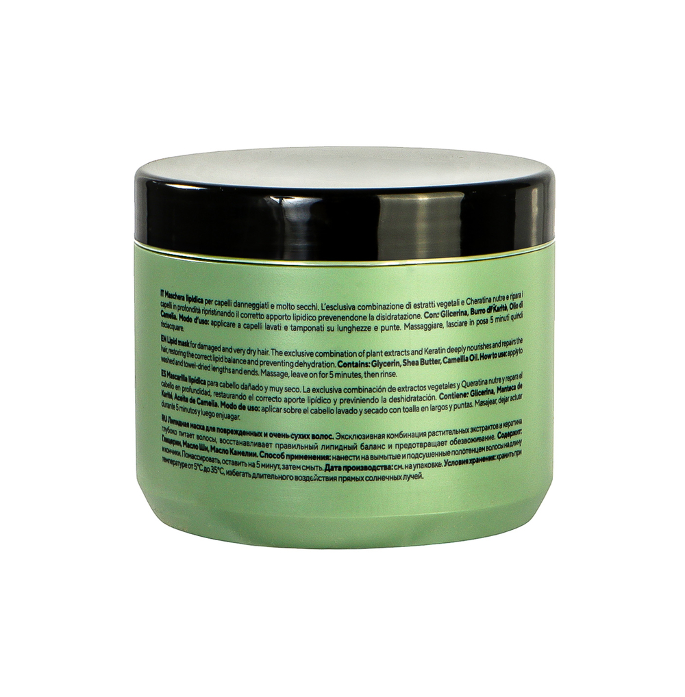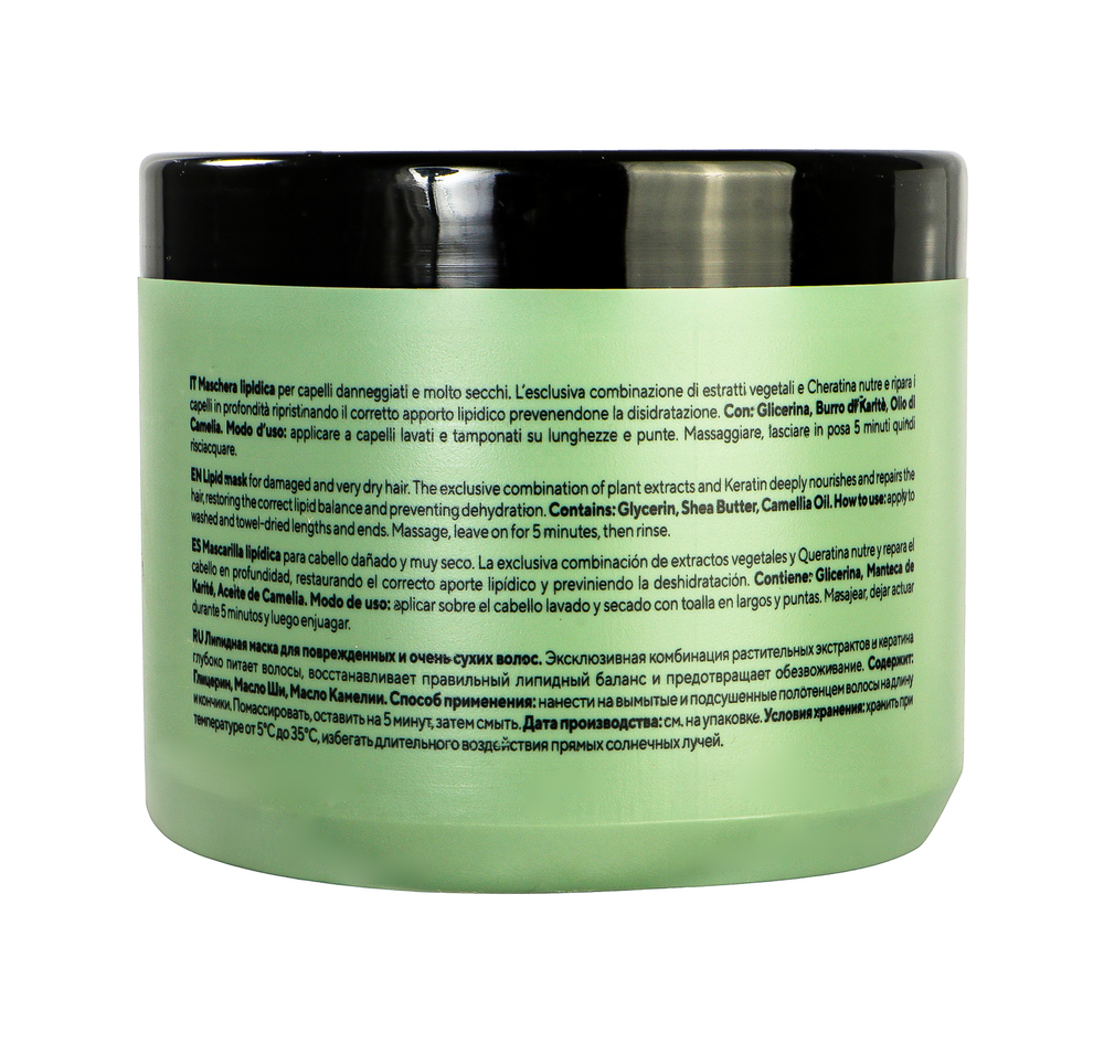 Липидная маска для поврежденных и очень сухих волос. Эксклюзивная комбинация растительных экстрактов и кератина глубоко питает волосы, восстанавливает правильный липидный баланс и предотвращает обезвоживание.