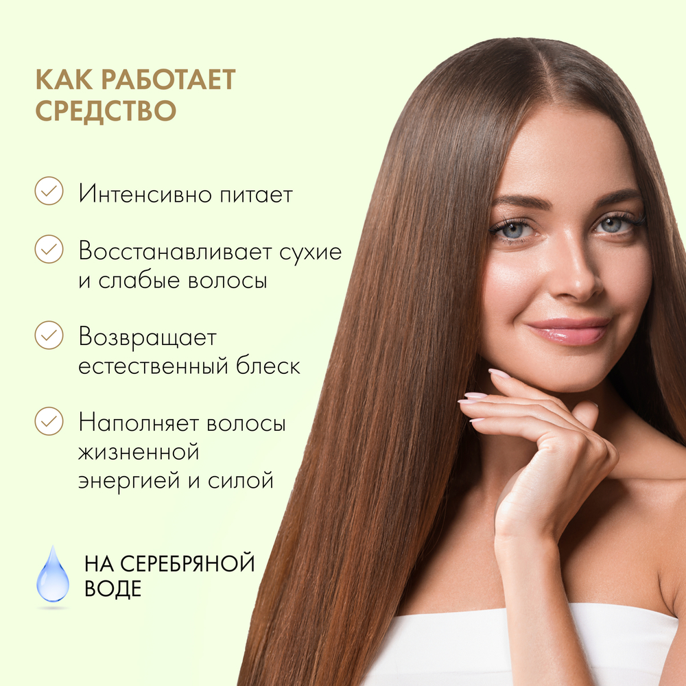 Репейное масло и органический экстракт семисильника укрепляют корни и препятствуют выпадению волос. Серебряная вода, обогащённая ионами био серебра, заряжает волосы энергией и наполняет их живительной влагой, придавая зеркальный блеск. Масло сибирского кедра богато комплексом витаминов Е, F и В, которые интенсивно питают волосы и придают естественный блеск и мягкость.
