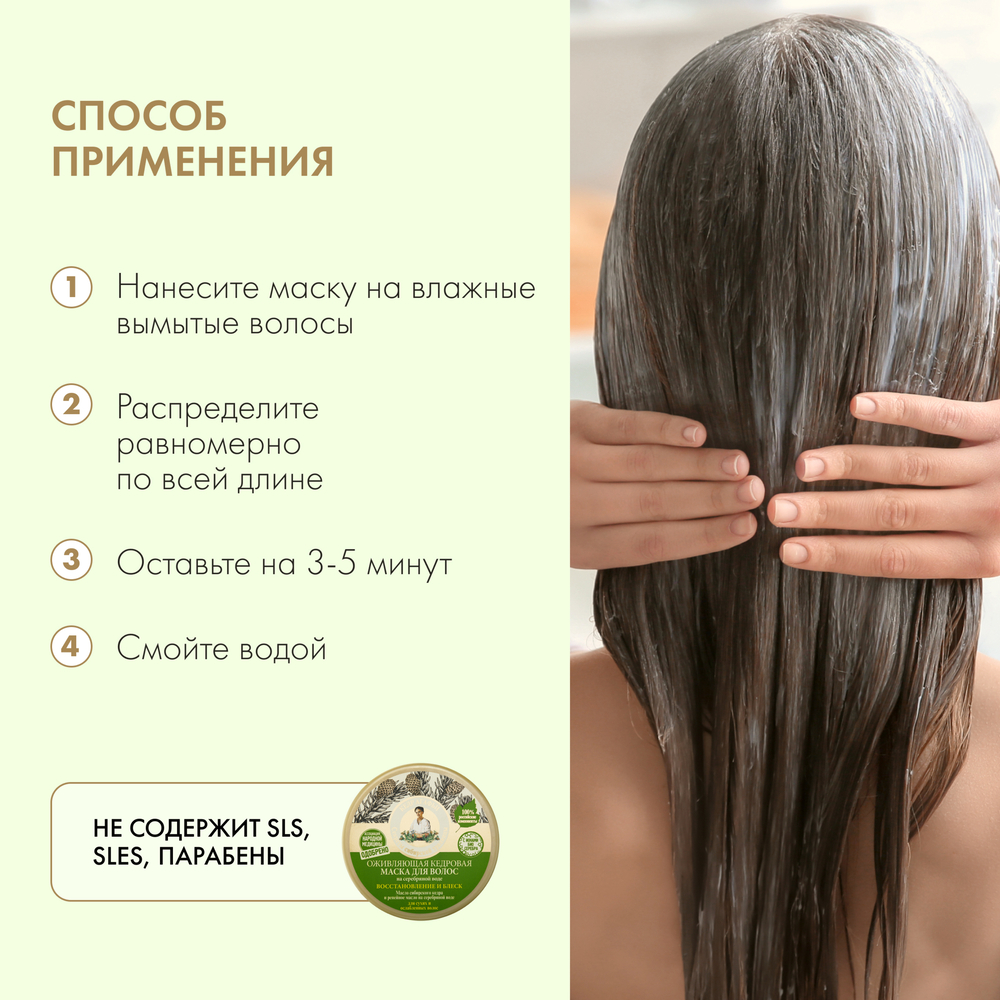 Оживляющая кедровая маска для волос на основе масла дикого сибирского кедра интенсивно питает, наполняя волосы жизненной энергией, силой и блеском.