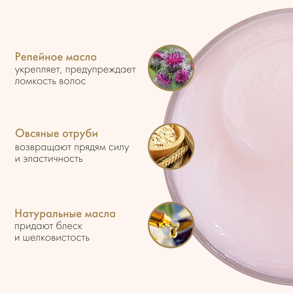 Репейное масло, незаменимое в уходе за волосами, обладает высокими восстанавливающими свойствами, способствует укреплению структуры волос, предупреждая их ломкость и сечение. Овсяные отруби питают поврежденные волосы, возвращая им силу и эластичность.