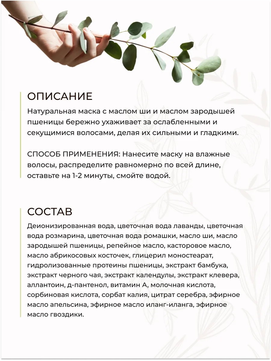 Натуральная маска с маслом ши и маслом зародышей пшеницы бережно ухаживает за ослабленными и секущимися волосами, делая их сильными и гладкими.