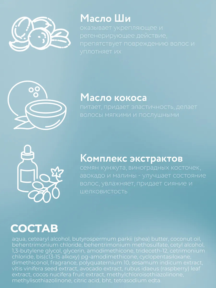 Аqua, cetearyl alcohol, butyrospermum parkii (shea) butter, coconut oil, behentrimonium chloride, behentrimonium methosulfate, cetyl alcohol, 1,3-butylene glycol, glycerin, amodimethicone, trideceth-12, cetrimonium chloride, bis(c13-15 alkoxy) pg-amodimethicone, cyclopentasiloxane, dimethiconol, fragrance, polyquaternium 10, sesamum indicum extract, vitis vinifera seed extract, avocado extract, rubus idaeus (raspberry) leaf extract, cocos nucifera fruit extract, methylchloroisothiazolinone, methylisothiazolinone, citric acid, bht, tetrasodium edta.