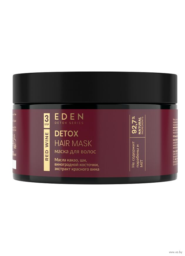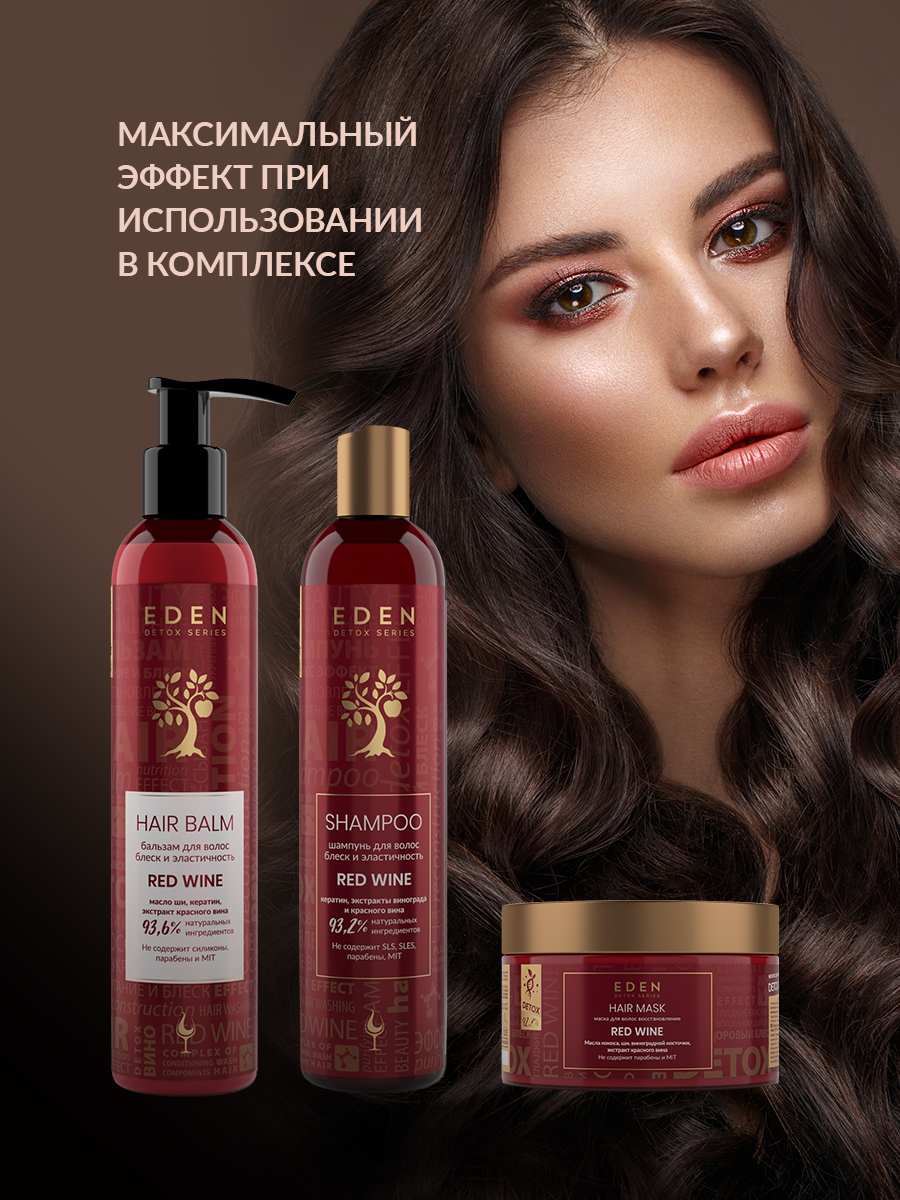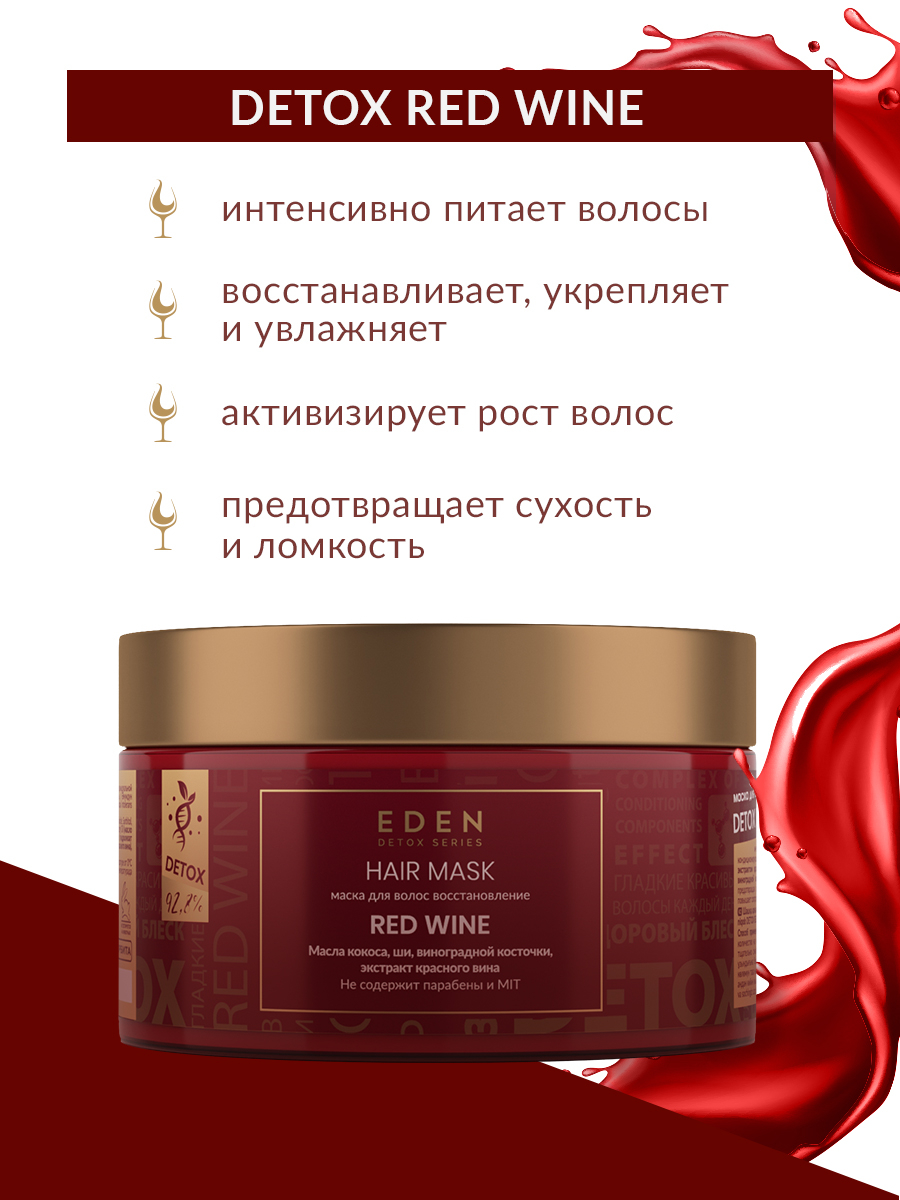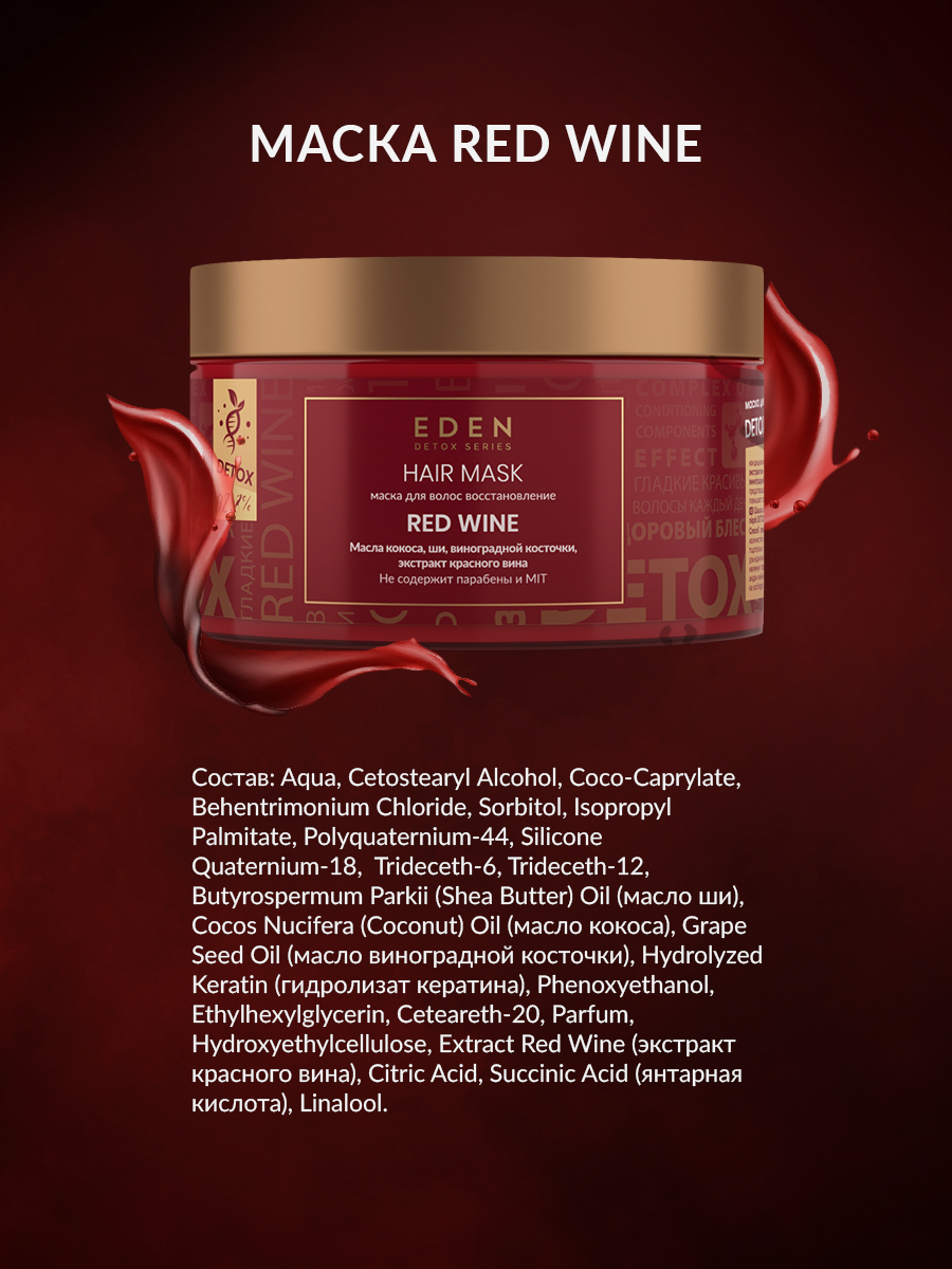 Благодаря формуле с натуральными ингредиентами – экстрактом красного вина, янтарной кислотой, гидролизатом кератина, маслами кокоса, ши и виноградной косточки – маска способствует выведению токсинов из волос и кожи головы, нормализует PH-баланс, восстанавливает и укрепляет волосы, предотвращая сухость и ломкость, препятствует выпадению и улучшает рост волос, разглаживает, повышает сопротивляемость агрессивным внешним факторам.