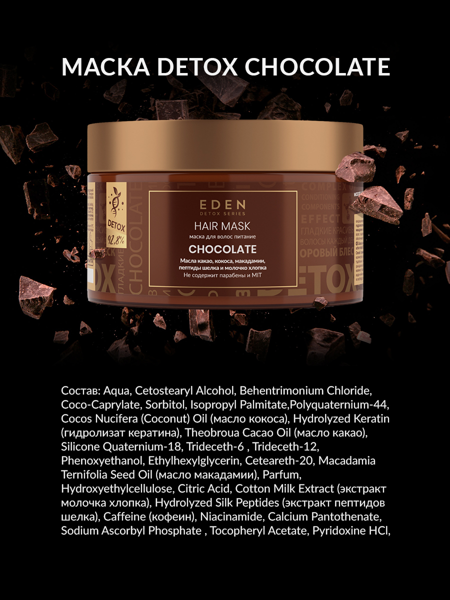 Aqua, Cetostearyl Аlcohol, Behentrimonium Сhloride, Coco-Caprylate, Sorbitol, Isopropyl Palmitate, Polyquaternium-44, Cocos Nucifera (Coconut) Oil (масло кокоса), Hydrolyzed Keratin (гидролизат кератина), Theobroua Cacao Oil (масло какао), Silicone Quaternium-18, Trideceth-6 , Trideceth-12, Phenoxyethanol, Ethylhexylglycerin, Ceteareth-20, Macadamia Ternifolia Seed Oil (масло макадамии), Parfum, Hydroxyethylcellulose, Citric Acid, Cotton Milk Extract (экстракт молочка хлопка), Hydrolyzed Silk Peptides (экстракт пептидов шелка), Caffeine (кофеин), Niacinamide, Calcium Pantothenate, Sodium Ascorbyl Phosphate , Tocopheryl Acetate, Pyridoxine HCl, Maltodextrin, Sodium Starch Octenylsuccinate, Silica (комплекс витаминов).