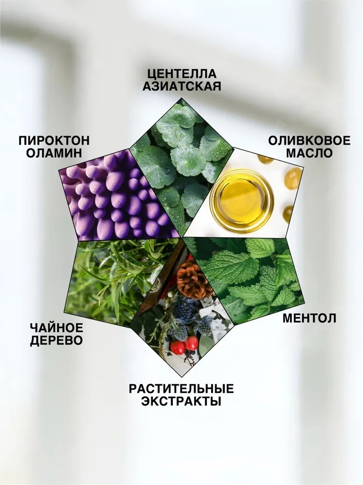 Ключевые ингредиенты включают экстракты чайного дерева и центеллы азиатской, которые обладают антисептическими и заживляющими свойствами, а также экстракты цитрусов, орегано и мелиссы, которые борются с перхотью и раздражением.