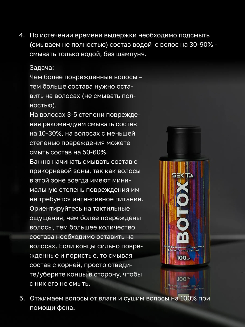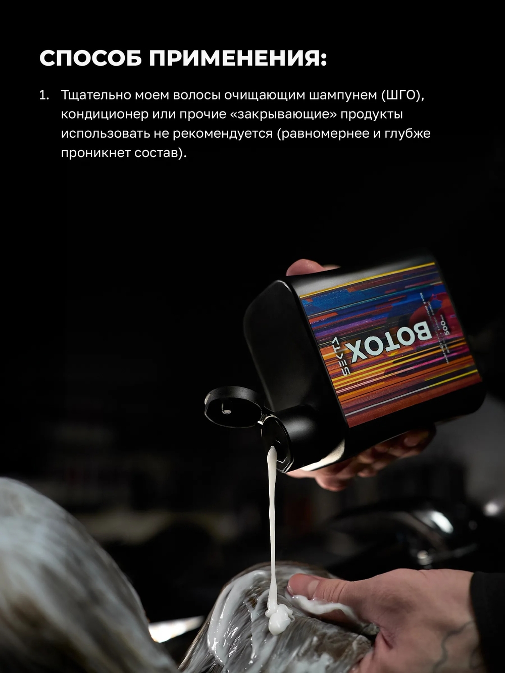 Подготовка волос: тщательно вымойте волосы с помощью очищающего шампуня. Использование кондиционера или других продуктов для «закрытия» пор не рекомендуется, чтобы состав мог глубже проникнуть в структуру волос. После мытья высушите волосы феном до 70-90% влажности.Состав