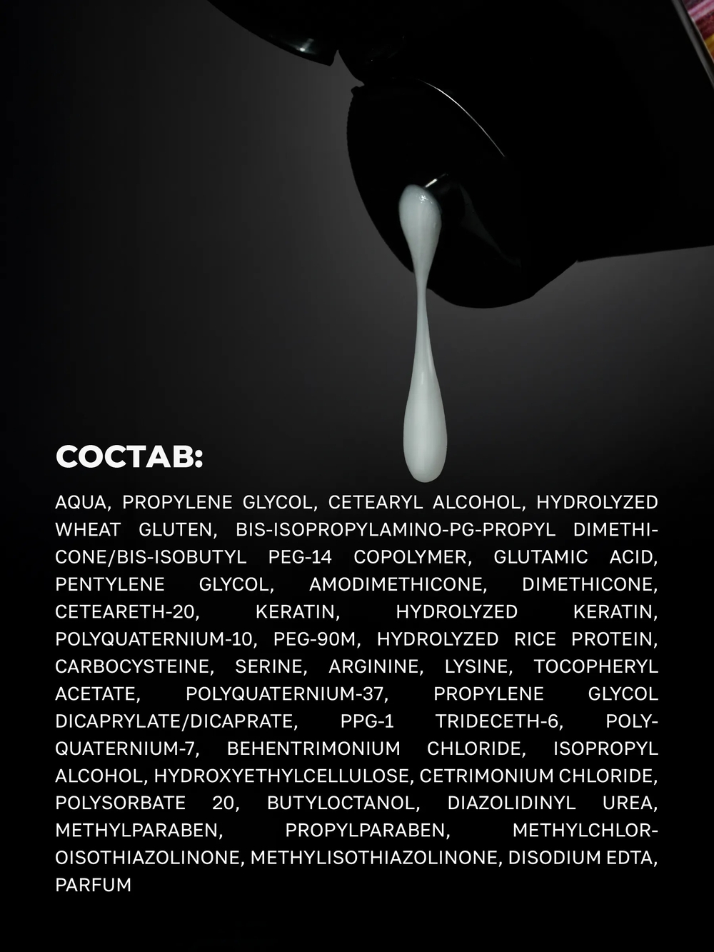 Аqua, propylene glycol, cetearyl alcohol, hydrolyzed wheat gluten, bis-isopropylamino-pg-propyl dimethicone/bis-isobutyl peg-14 copolymer, glutamic acid, pentylene glycol, amodimethicone, dimethicone, ceteareth-20, keratin, hydrolyzed keratin, polyquaternium-10, peg-90m, hydrolyzed rice protein, carbocysteine, serine, arginine, lysine, tocopheryl acetate, polyquaternium-37, propylene glycol dicaprylate/dicaprate, ppg-1 trideceth-6, polyquaternium-7, behentrimonium chloride, isopropyl alcohol, hydroxyethylcellulose, cetrimonium chloride, polysorbate 20, butyloctanol, diazolidinyl urea, methylparaben, propylparaben, methylchloroisothiazolinone, methylisothiazolinone, disodium edta, parfum.