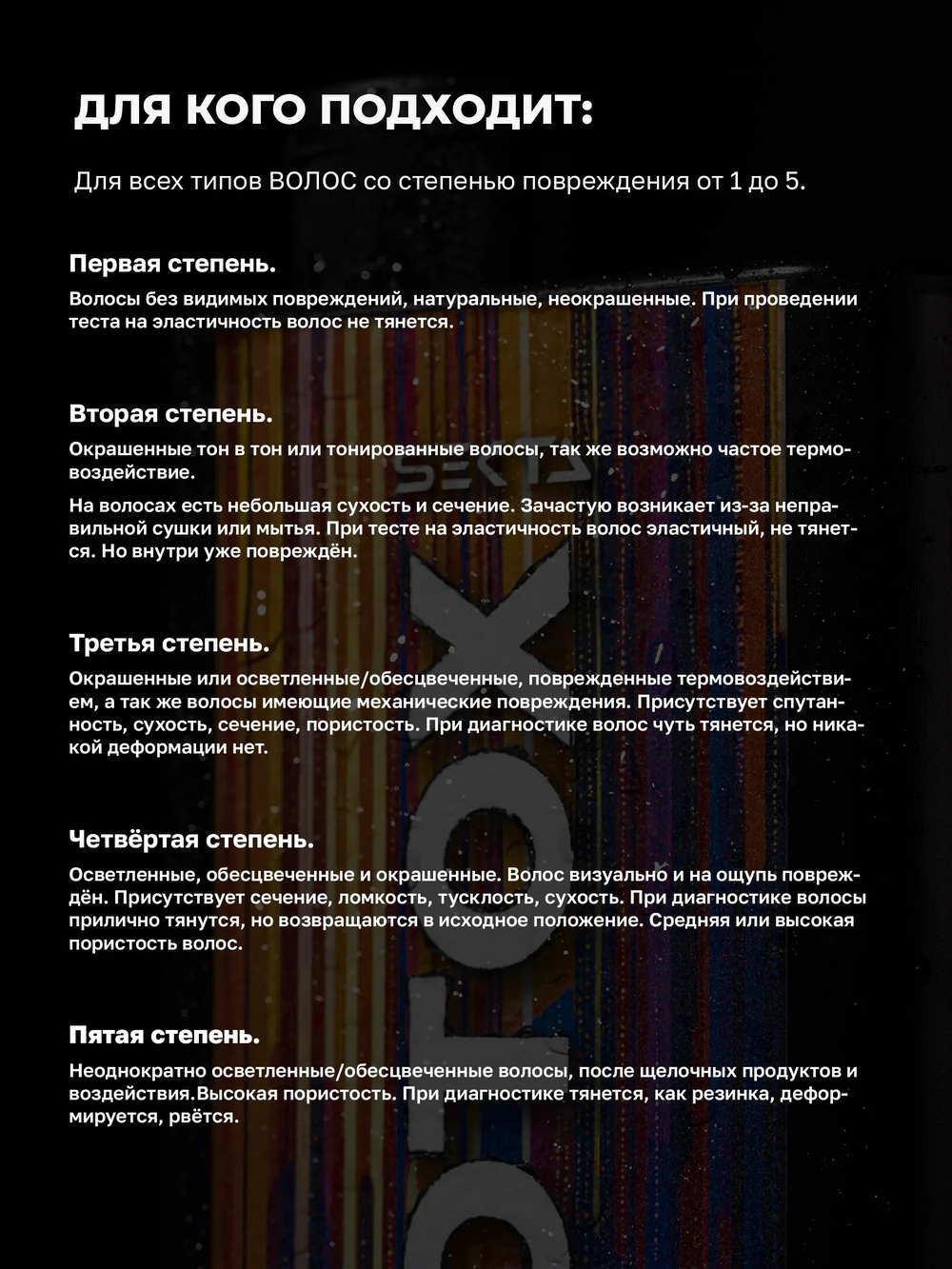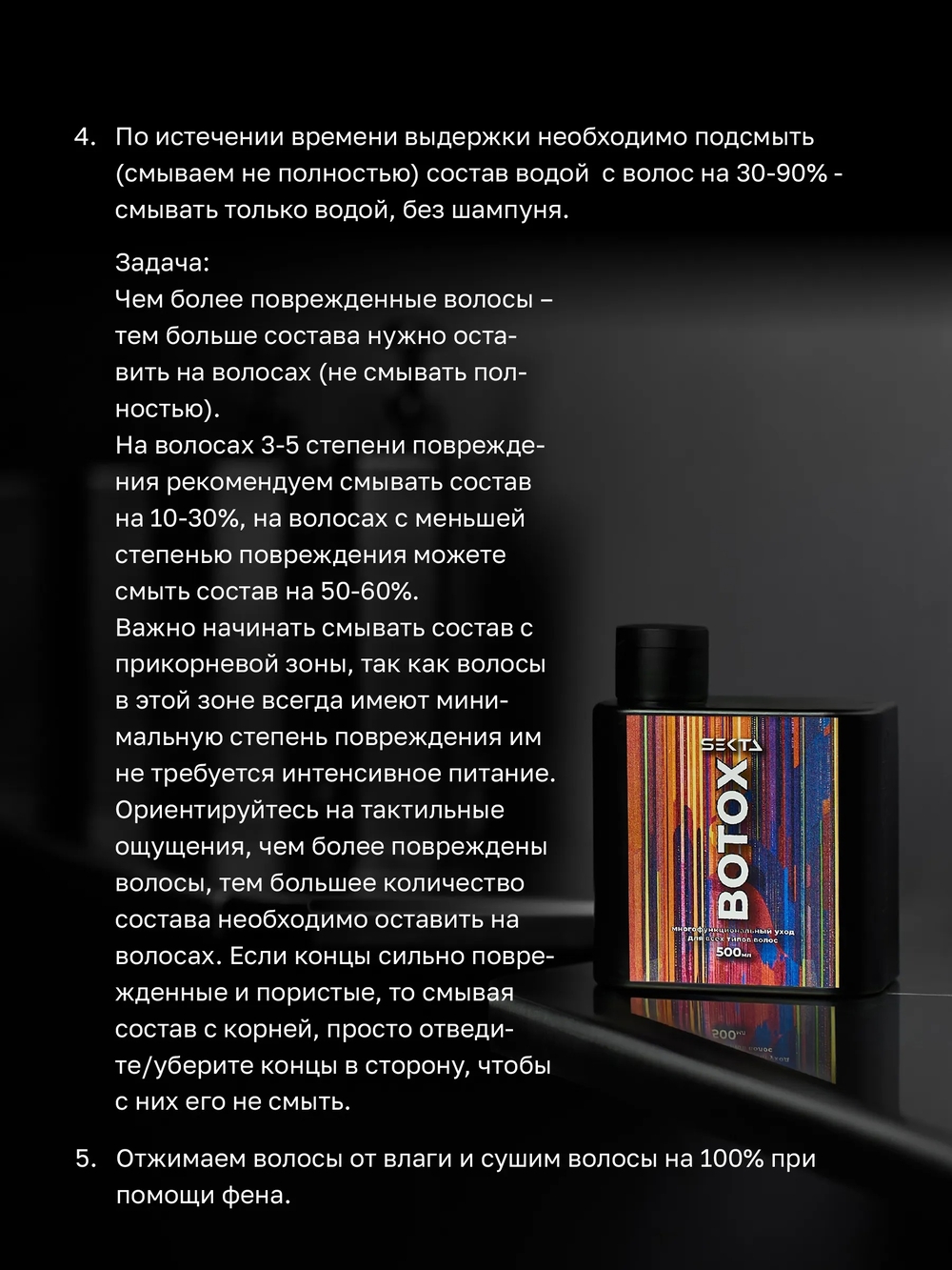 Подготовка волос: тщательно вымойте волосы с помощью очищающего шампуня. Использование кондиционера или других продуктов для «закрытия» пор не рекомендуется, чтобы состав мог глубже проникнуть в структуру волос. После мытья высушите волосы феном до 70-90% влажности.Состав