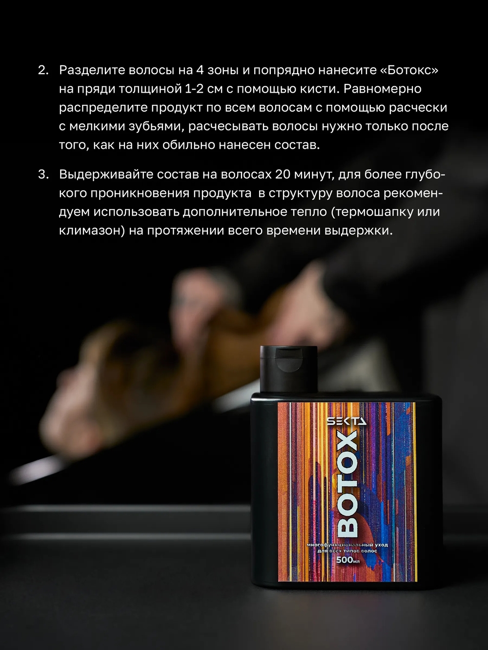 Ботокс – многофункциональный уход для всех типов волос. Реконструирует качество и состояние волос после любого негативного/химического воздействия, преимущественно уплотняя и дисциплинируя все полотно волос. Помимо внутренних процессов очевидный визуальный блеск и гладкость волос – против пористости. Упрощает укладку, не выпрямляет волосы.