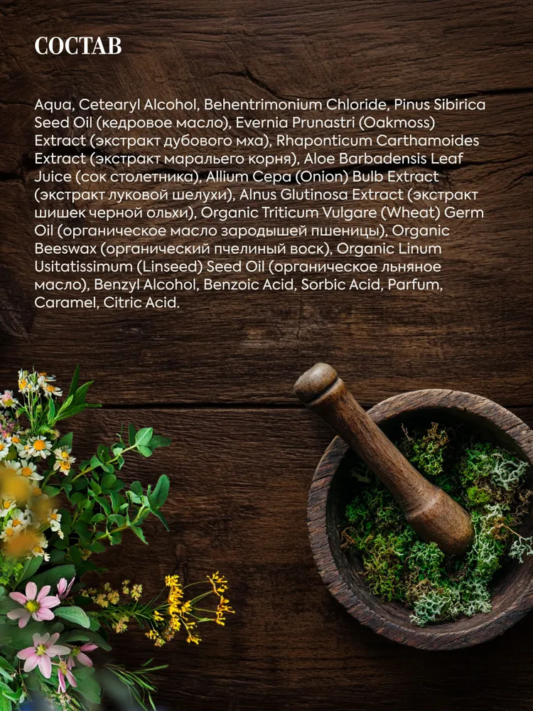 Aqua, Cetearyl Alcohol, Behentrimonium Chloride, Pinus Sibirica Seed Oil (кедровое масло), Evernia Prunastri (Oakmoss) Extract (экстракт дубового мха), Rhaponticum Carthamoides Extract (экстракт маральего корня), Aloe Barbadensis Leaf Juice (сок столетника), Allium Cepa (Onion) Bulb Extract (экстракт луковой шелухи), Alnus Glutinosa Extract (экстракт шишек черной ольхи), Organic Triticum Vulgare (Wheat) Germ Oil (органическое масло зародышей пшеницы), Organic Beeswax (органический пчелиный воск), Organic Linum Usitatissimum (Linseed) Seed Oil (органическое льняное масло), Benzyl Alcohol, Benzoic Acid, Sorbic Acid, Parfum, Caramel, Citric Acid.