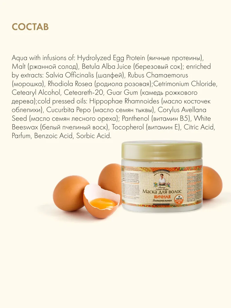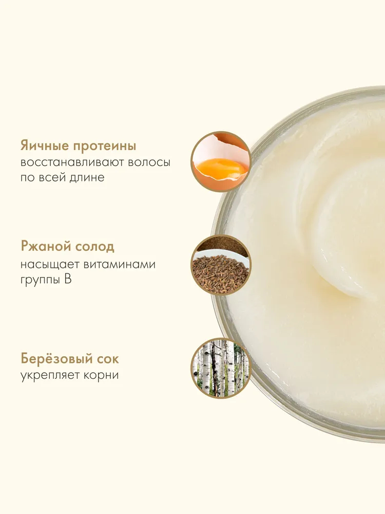 Aqua with infusions of: Hydrolyzed Egg Protein (яичные протеины), Malt (ржанной солод), Betula Alba Juice (березовый сок); enriched by extracts: Salvia Officinalis (шалфей), Rubus Chamaemorus (морошка), Rhodiola Rosea (родиола розовая);Cetrimonium Chloride, Cetearyl Alcohol, Ceteareth-20, Guar Gum (камедь рожкового дерева);cold pressed oils: Hippophae Rhamnoides (масло косточек облепихи), Cucurbita Pepo (масло семян тыквы), Corylus Avellana Seed (масло семян лесного ореха); Panthenol (витамин B5), White Beeswax (белый пчелиный воск), Tocopherol (витамин Е), Citric Acid, Parfum, Benzoic Acid, Sorbic Acid.