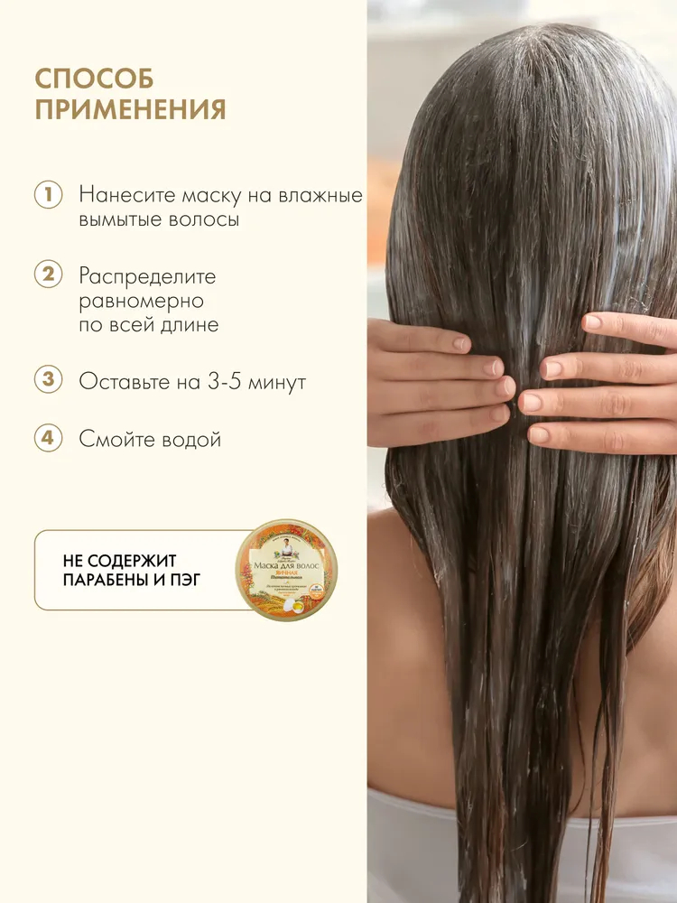 Нанесите маску на чистые влажные волосы. Равномерно распределить по всей длине и у корней волос. Через 1-2 минуты смыть водой.Состав