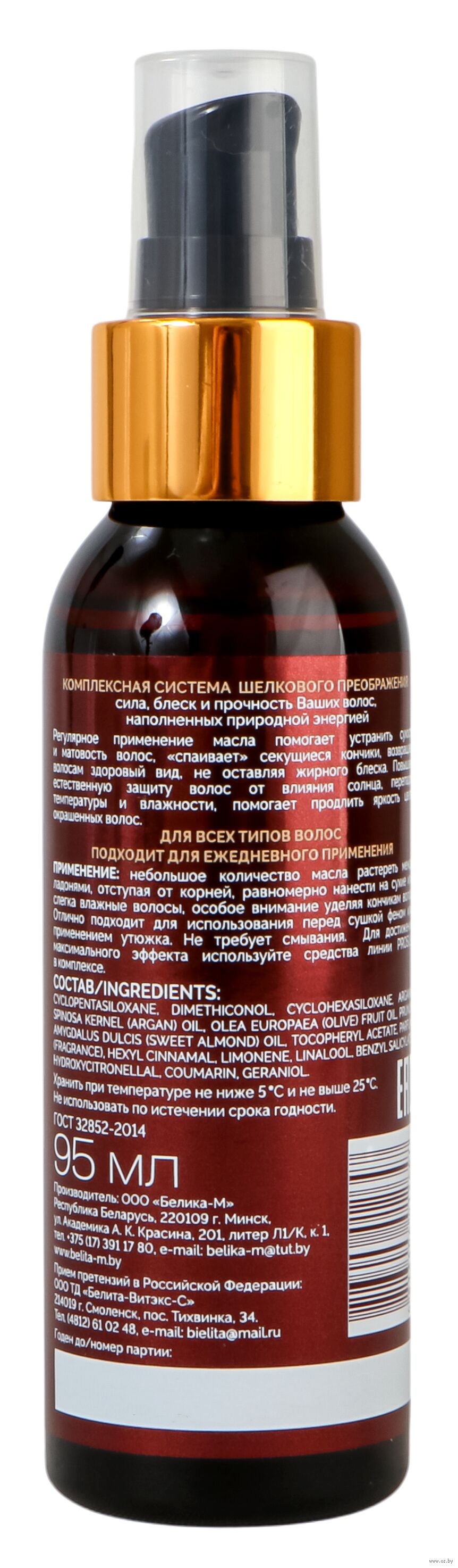 100% натуральные масла арганы, оливы и миндаля. Эликсир красоты и сияния! Особая формула, основанная на синергии 3 ценных масел, уже с первого применения значительно улучшает внешний вид и состояние волос: снимает статику, делает их послушными, блестящими и шелковистыми.