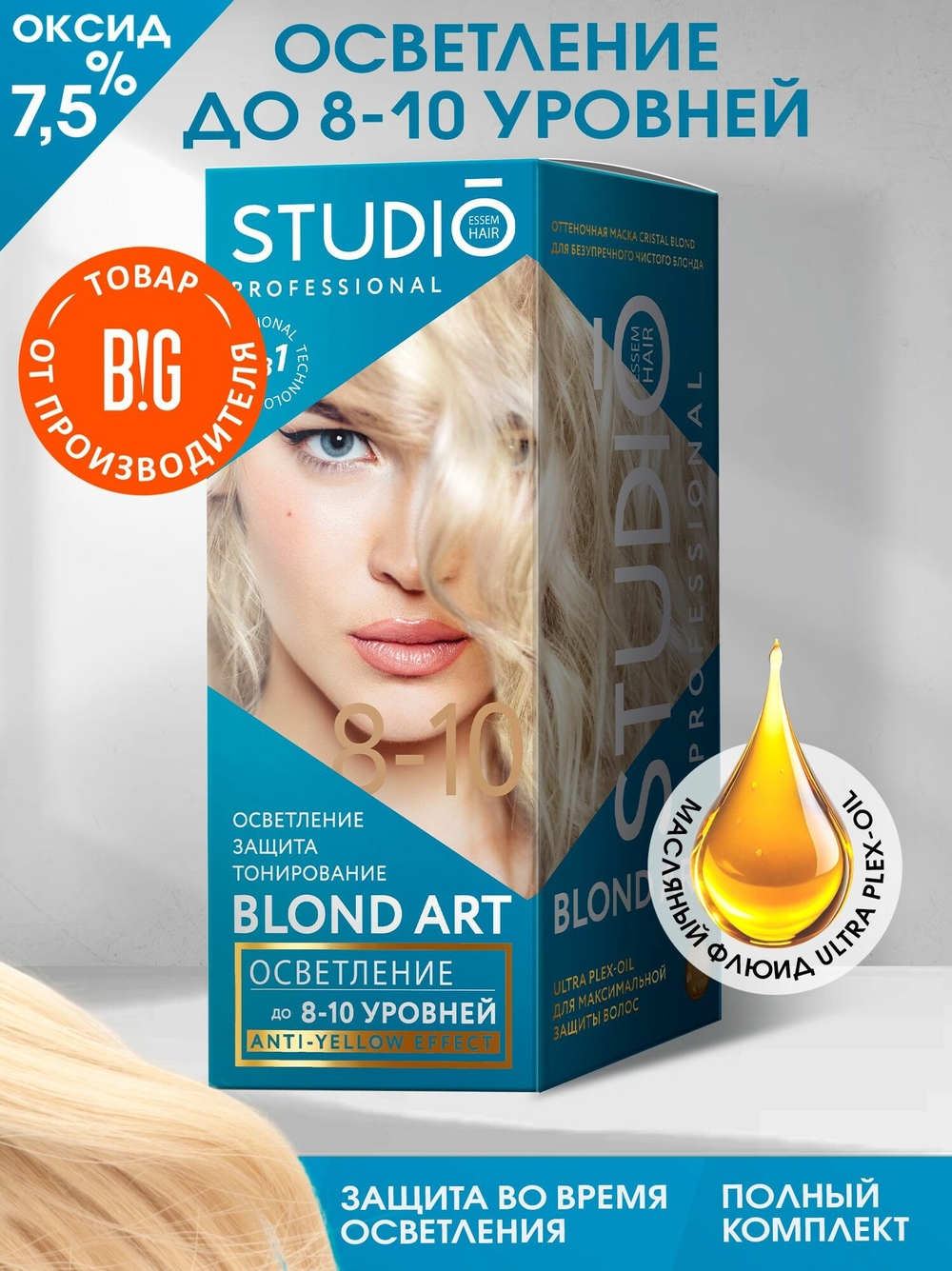 Профессиональный осветляющий порошок равномерно распределяется по всей поверхности волос, обеспечивая качественное осветление до 10 уровней. Масляный флюид обеспечивает надежную защиту от повреждений волос во время процедуры осветления. Оттеночная маска максимально нейтрализует нежелательные желтые оттенки, поддерживая кристально-чистый цвет блонда и усиливая сияние волос.