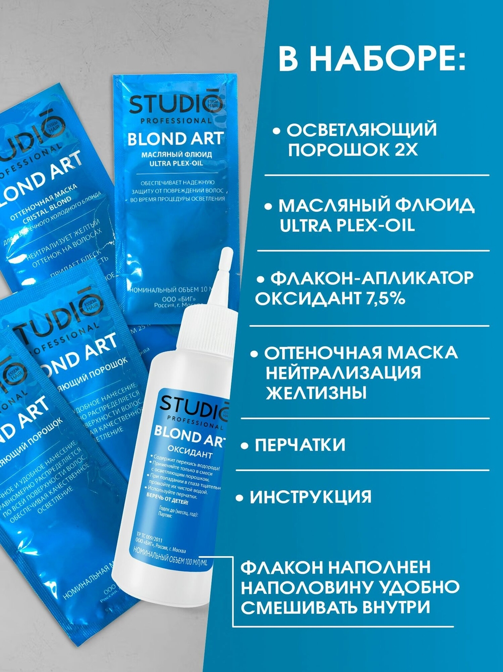 Осветляющий порошок: Potassium Persulfate, Sodium Silicate, Magnesium Carbonate Hydroxide, Diethylhexyl Carbonate, Ammonium Persulfate, Sodium Stearate, Xanthan Gum, Oryza Sativa (Rice) Starch, Algin, Tetrasodium EDTA, Silica, C.I. 77007.