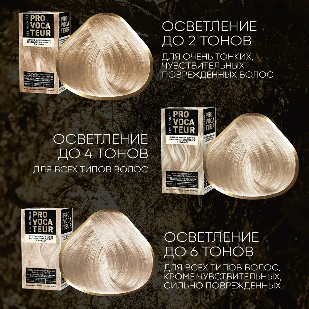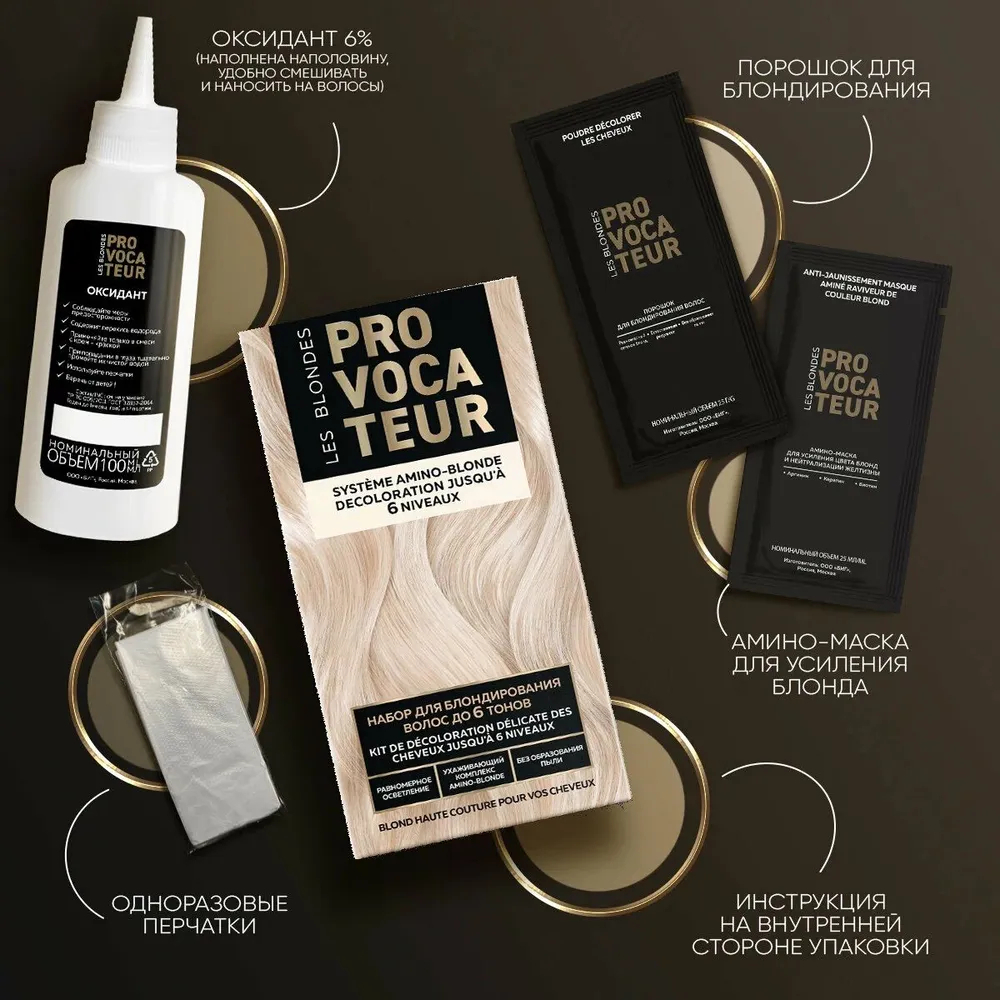 Новый подход к осветлению волос, салонный результат у вас дома. Полный сет для домашнего применения – для роскошного блонда, наполненного сиянием! В состав упаковки входит: осветляющий порошок (2*25 г), оксидант (100 мл), амино-маска для усиления цвета блонд и нейтрализации желтизны (25 мл), пара перчаток, инструкция по применению. Профессиональный порошок для блондирования волос применяется для блондирования (осветления) с равномерным естественным результатом для всех типов волос, кроме сильно поврежденных, до 6 тонов, снятия пигмента для последующего тонирования и техник частичного осветления/мелирования волос.