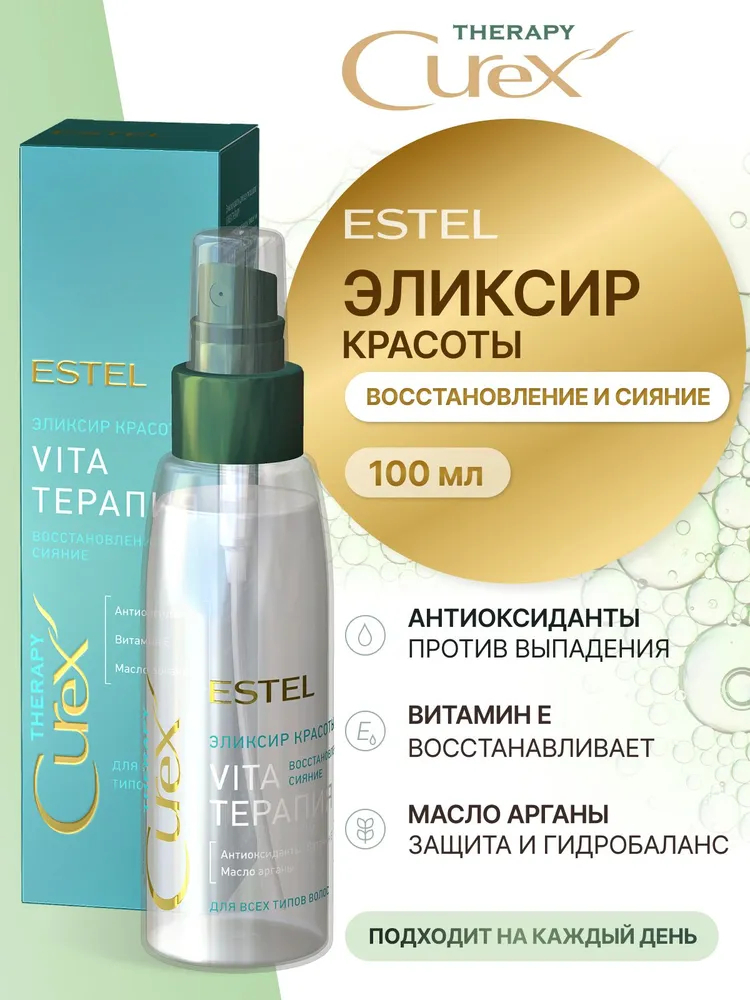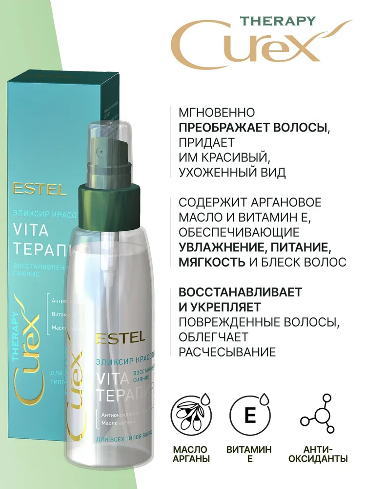 Эликсир красоты мгновенно преображает волосы, придает им ухоженный вид. Продукт содержит аргановое масло и витамин Е, обеспечивающие увлажнение, питание, мягкость и блеск волос, восстанавливает и укрепляет поврежденные волосы, облегчает расчесывание.