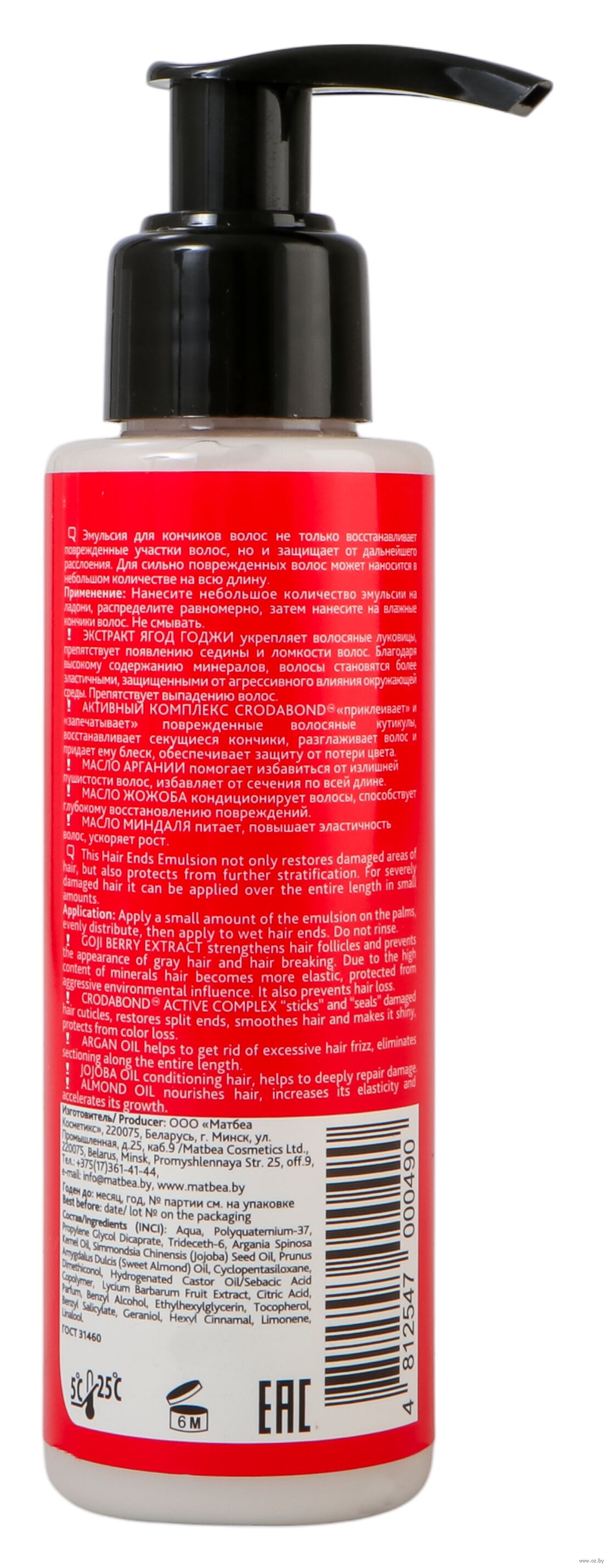 Нанесите небольшое количество эмульсии на ладони, распределите равномерно, затем нанесите на влажные кончики волос. Не смывать.Состав