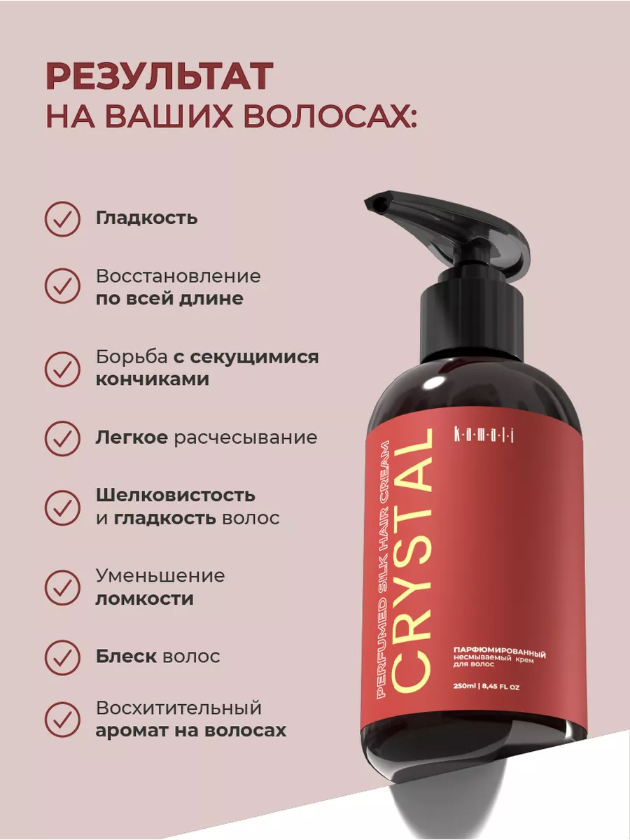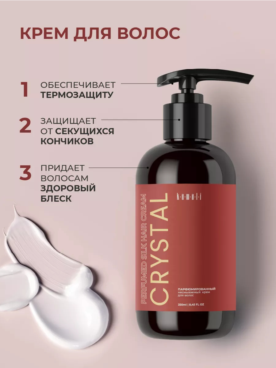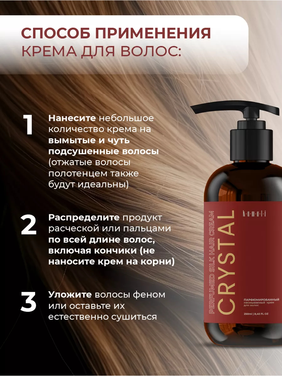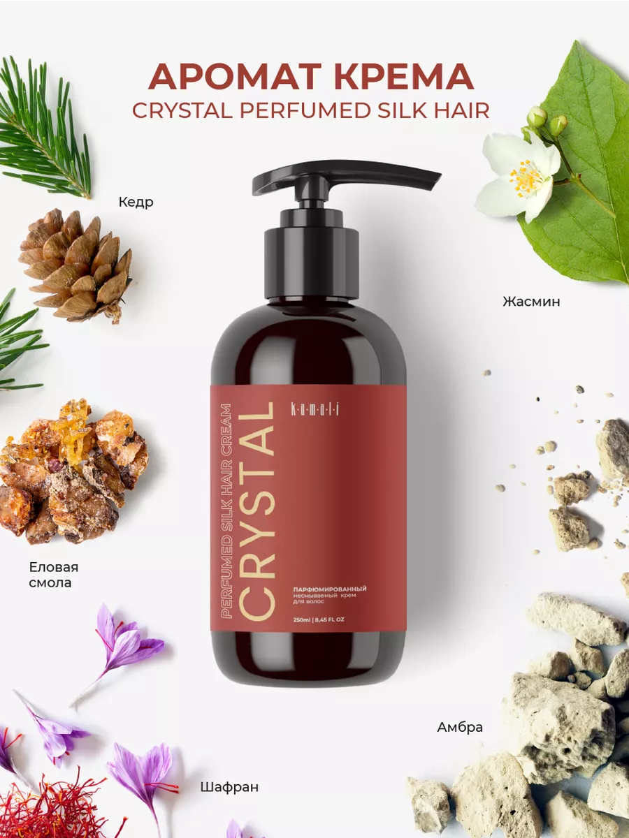Парфюмированный несмываемый крем Kamali – ваш ключ к легкому расчесыванию и шелковистым волосам. Он облегчит уход за волосами и уменьшит пушистость, делая ваши волосы послушными, мягкими и блестящими. Волшебство крема заключено в аромате нишевой парфюмерии на волосах: Crystal пригласит вас в мир роскоши и изысканности.