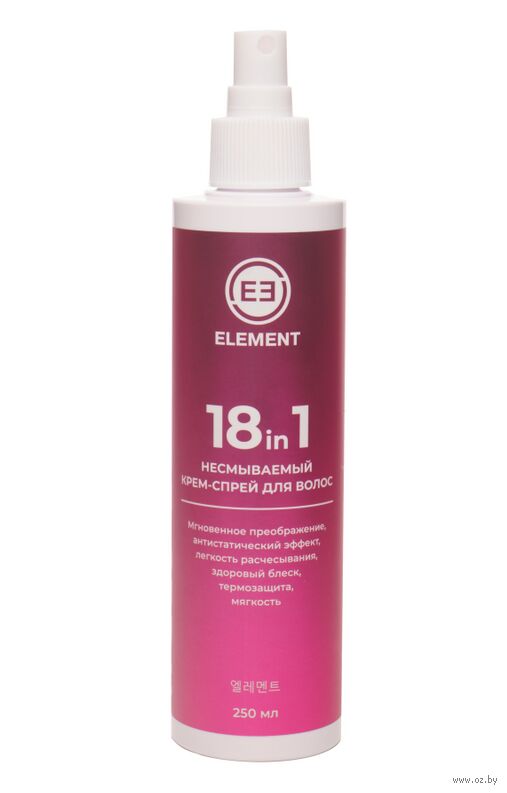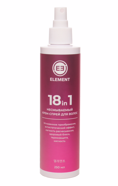 Несмываемый крем-спрей для волос Element 18в1 – это уникальное средство для ухода за волосами, которое сочетает в себе 18 преимуществ для красоты и здоровья ваших волос: 1. Питание; 2. Увлажнение; 3. Эластичность; 4. Здоровый блеск; 5. Мягкость; 6. Кондиционирование без утяжеления; 7. Эффект густоты; 8. Эффект плотности волос; 9. Термозащита при сушке и укладке; 10. Антистатический эффект; 11. Запечатывание волоса; 12. Легкое расчесывание; 13. Защита от воздействия внешней среды; 14. Защита цвета; 15. Маскировка секущихся кончиков; 16. Борьба с пористостью; 17. Приятный аромат; 18. Здоровый вид волос.
