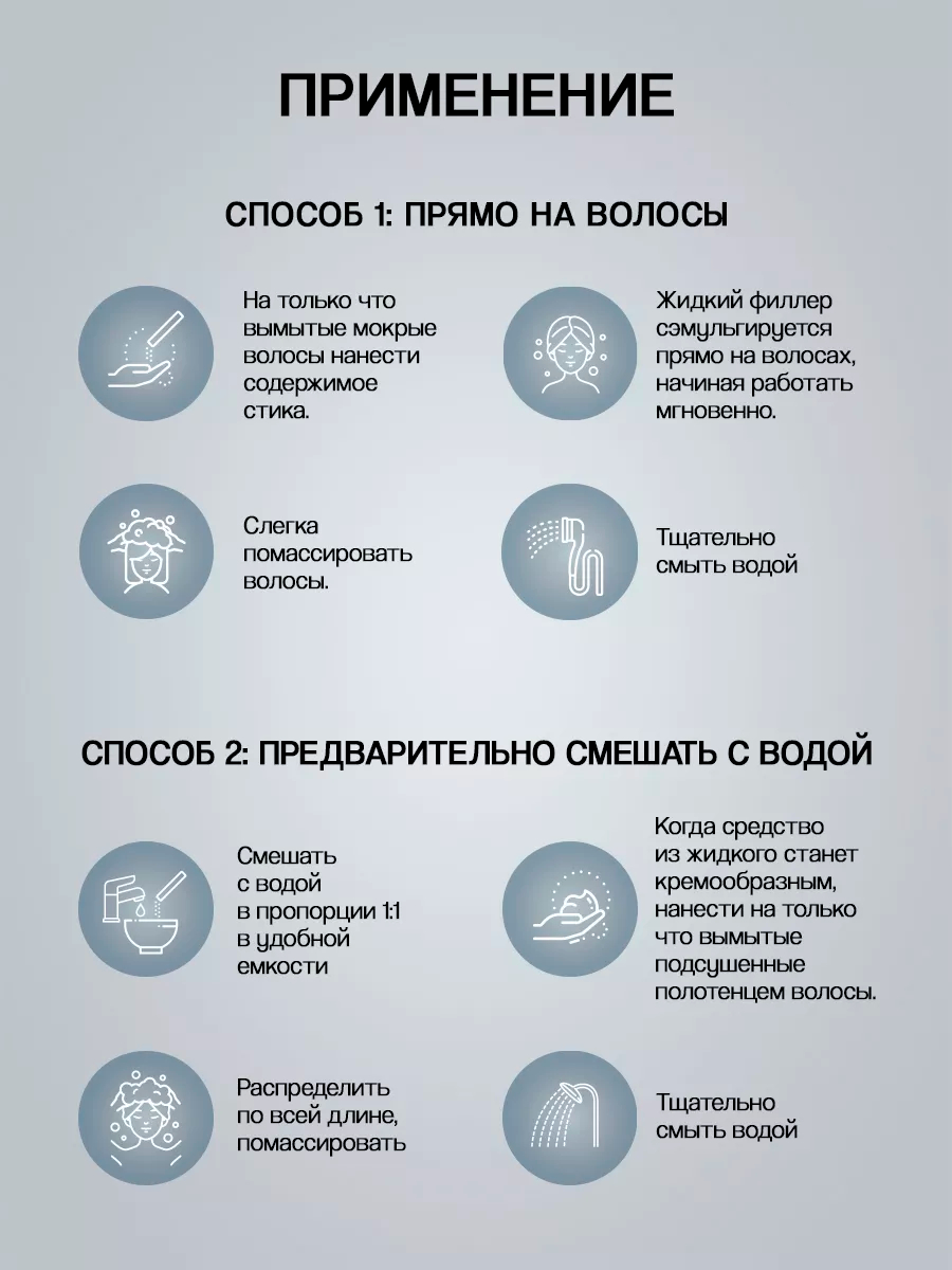 1 способ: смешать с водой в пропорции 1:1 в удобной емкости. Когда средство станет кремообразным, нанести на чистые мокрые волосы. Распределить по всей длине, помассировать, смыть прохладной водой*. 2 способ: на вымытые мокрые волосы нанести содержимое стика. Распределить по всей длине волос, помассировать, смыть прохладной водой*. *Прохладная вода способствует разглаживанию чешуек волоса, локоны становятся более упругими и блестящими. Рекомендуется использовать 1 раз в неделю. Продукт имеет накопительный эффект. Расход средства: 1 стик для волос средней длины.Состав
