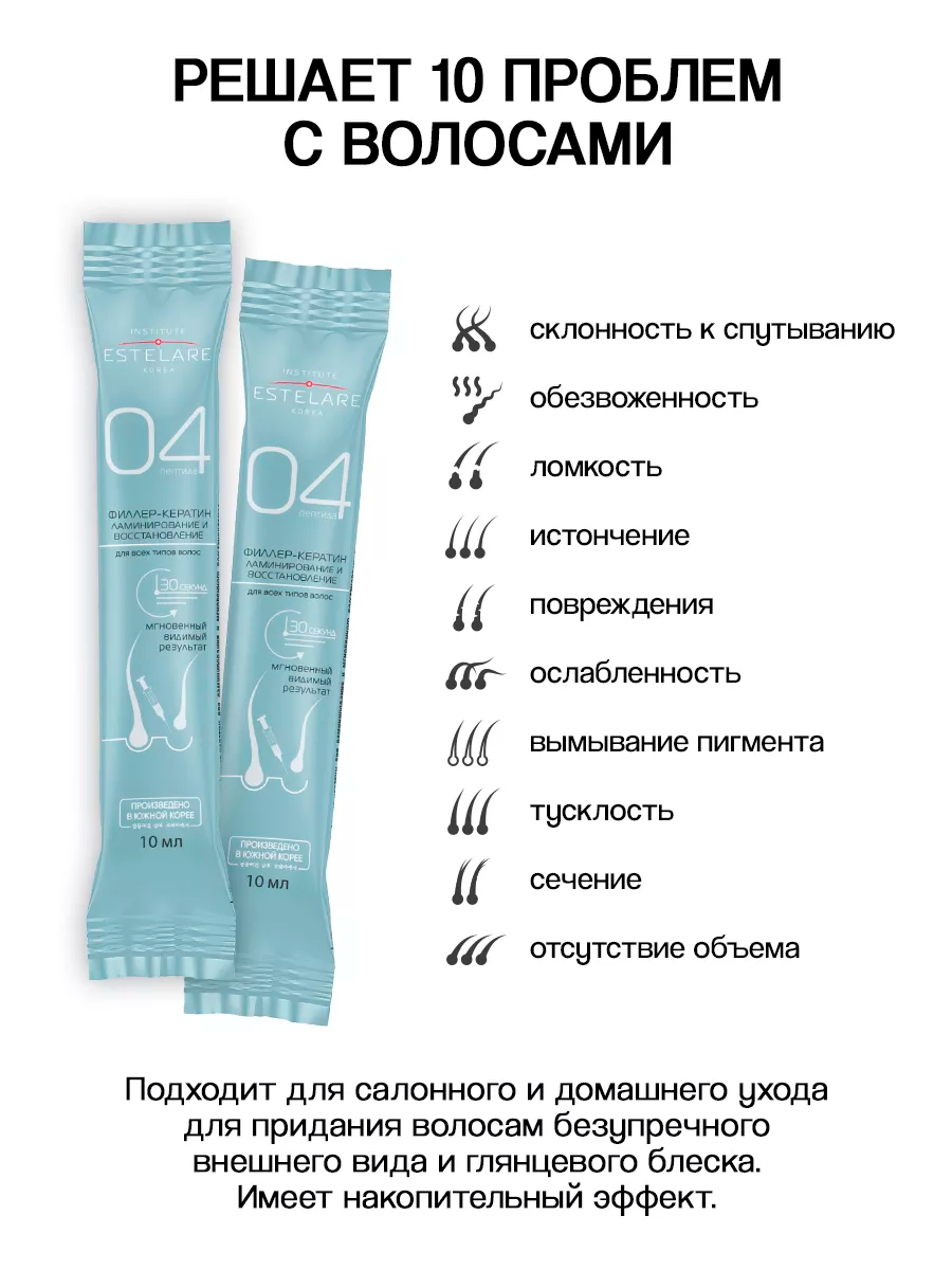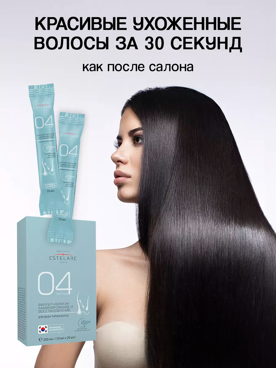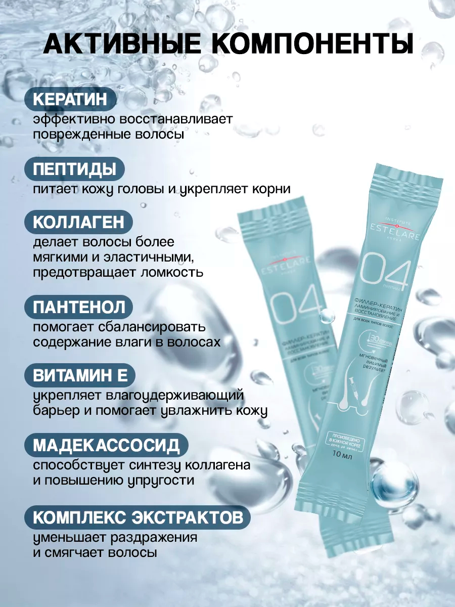 Насыщенная концентрированная формула филлера с комплексом пептидов, кератином, витамином Е, растительными экстрактами мгновенно восстанавливает волосы: разглаживает чешуйки, заполняет стержень локонов изнутри, запаивает секущиеся кончики, делает волосы более плотными, густыми, уменьшает ломкость, придает зеркальный блеск как после процедуры ламинирования волос. Филлер-кератин подходит для всех типов волос.
