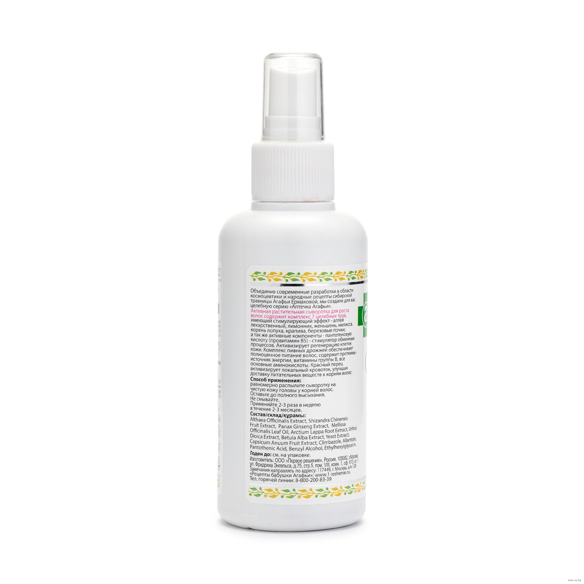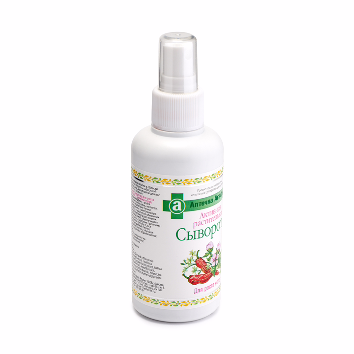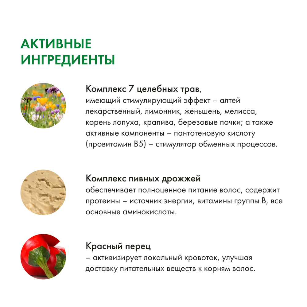 Активная растительная сыворотка для роста волос содержит комплекс 7 целебных трав, имеющий стимулирующий эффект – алтей лекарственный, лимонник, женьшень, мелисса, корень лопуха, крапива, березовые почки; а также активные компоненты – пантотеновую кислоту (провитамин В5) – стимулятор обменных процессов. Активизирует регенерацию клеток кожи.