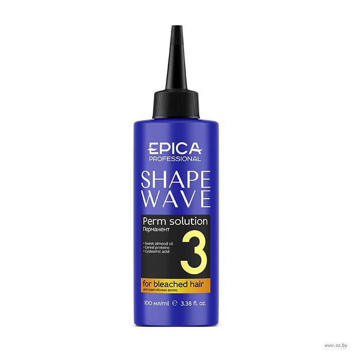 Перманент для осветлённых волос "Shape Wave" на основе цистеаминовой кислоты. Лосьон перманент для химической завивки позволяет создавать привлекательные локоны, сохраняя натуральную эластичность волос. Деликатная формула заботится о волосах, моделирует их и обеспечивает защиту во время завивки. Обладает приятным запахом. Входящие в состав гидролизованные белки пшеницы, касторовое и миндальное масла защищают волосы и придают им мягкость и блеск. Без содержания тиогликолевой кислоты.